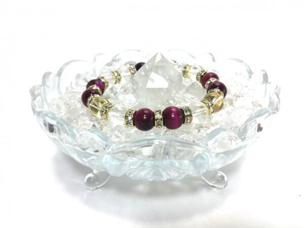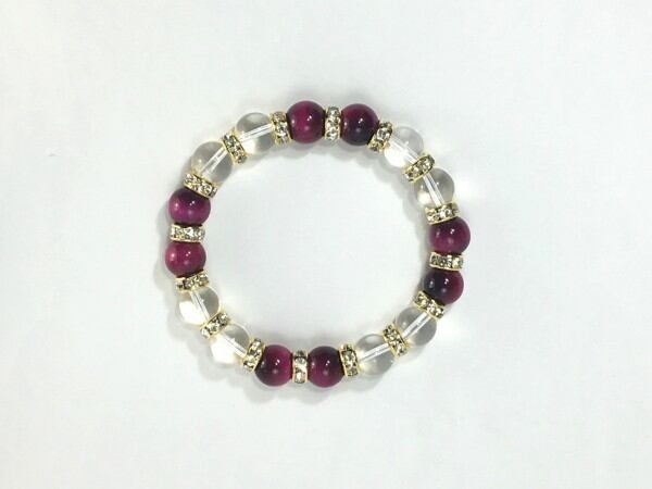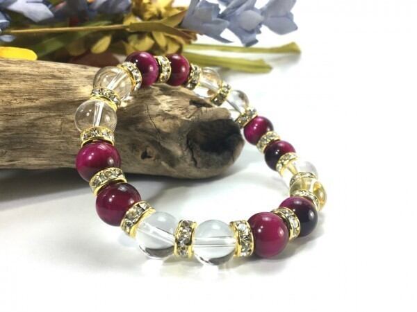 こちらは、ピンクタイガーアイと水晶を組み合わせたブレスレットです。間にはロンデルを挟み高級感あるデザインに仕上がっています。石大きさは腕にも馴染みやすいように10mm玉で内周約16cm(伸可能)です。数に限りがございますので気になる方はお早めにどうぞ。
