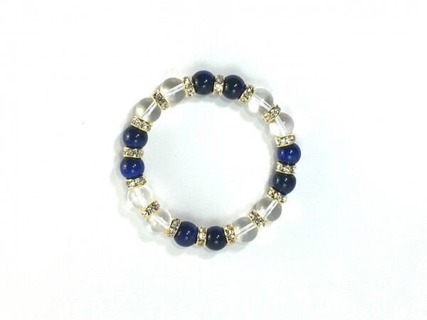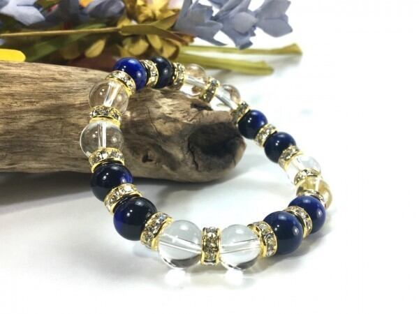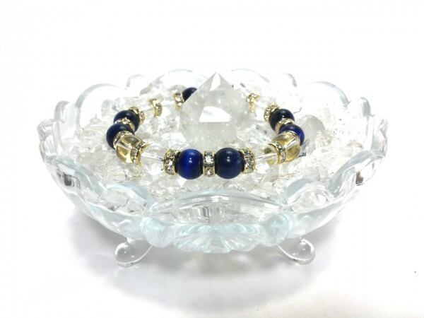 こちらは、ブルータイガーアイと水晶を組み合わせたブレスレットです。間にはロンデルを挟み高級感あるデザインに仕上がっています。石大きさは腕にも馴染みやすいように10mm玉で内周約16cm(伸可能)です。数に限りがございますので気になる方はお早めにどうぞ。