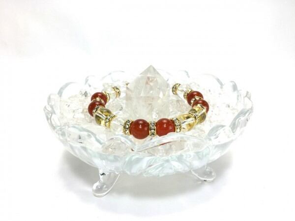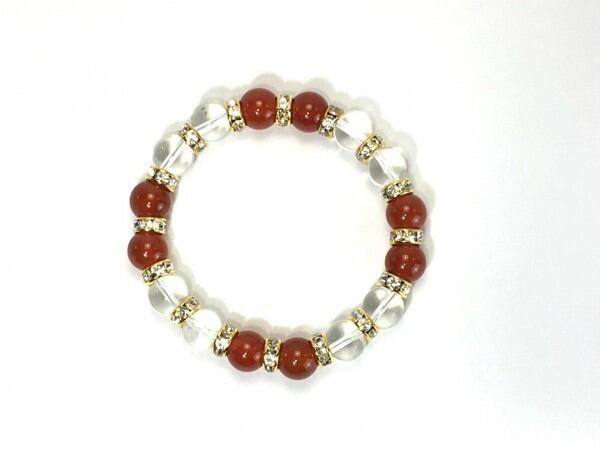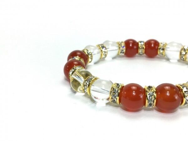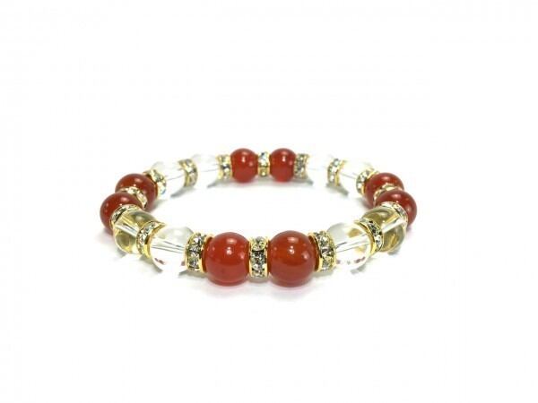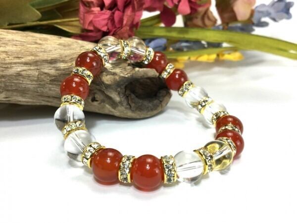 こちらは、赤瑪瑙と水晶を組み合わせたブレスレットです。間にはロンデルを挟み高級感あるデザインに仕上がっています。石大きさは腕にも馴染みやすいように10mm玉で内周約16cm(伸可能)です。数に限りがございますので気になる方はお早めにどうぞ。