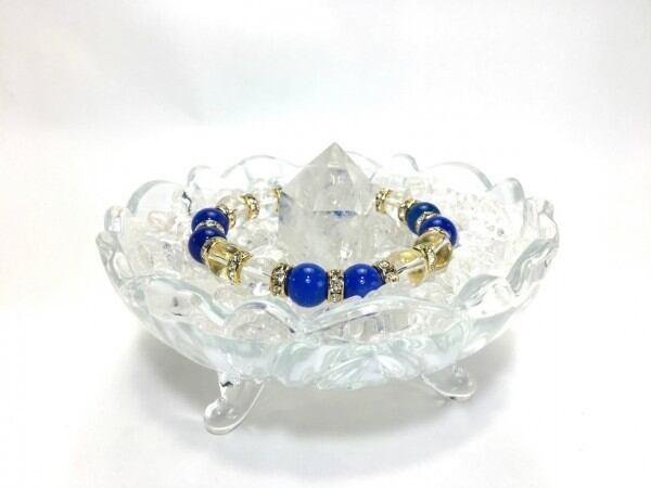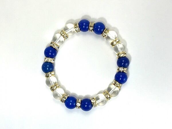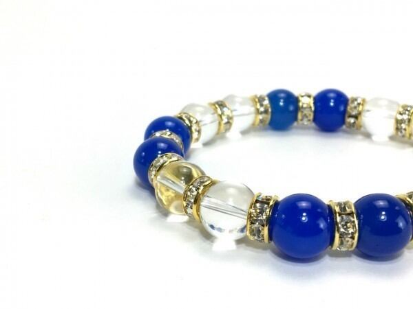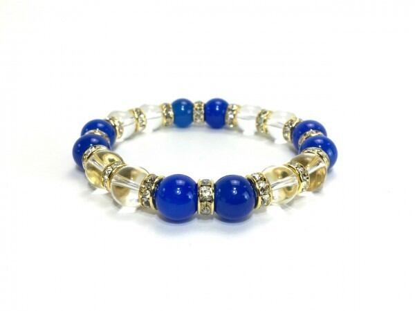 こちらは、ブルーメノウと水晶を組み合わせたブレスレットです。間にはロンデルを挟み高級感あるデザインに仕上がっています。石大きさは腕にも馴染みやすいように10mm玉で内周約16cm(伸可能)です。数に限りがございますので気になる方はお早めにどうぞ。