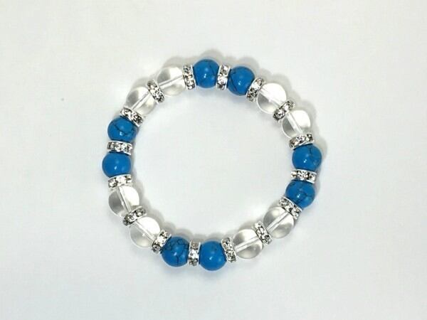 こちらは、ターコイズと水晶を組み合わせたブレスレットです。間にはロンデルを挟み高級感あるデザインに仕上がっています。石大きさは腕にも馴染みやすいように10mm玉で内周約16cm(伸可能)です。数に限りがございますので気になる方はお早めにどうぞ。