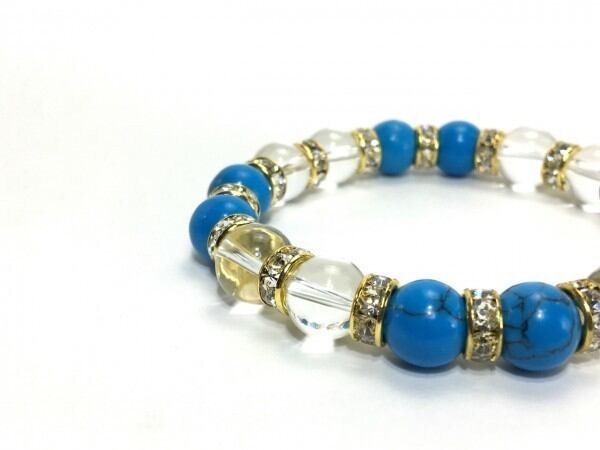 こちらは、ターコイズと水晶を組み合わせたブレスレットです。間にはロンデルを挟み高級感あるデザインに仕上がっています。石大きさは腕にも馴染みやすいように10mm玉で内周約16cm(伸可能)です。数に限りがございますので気になる方はお早めにどうぞ。