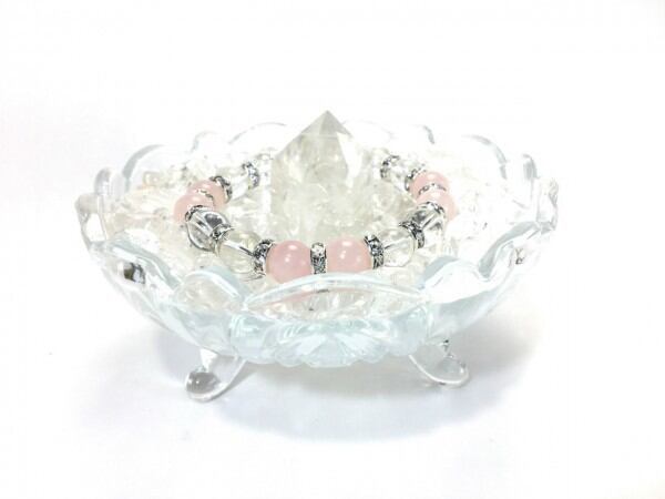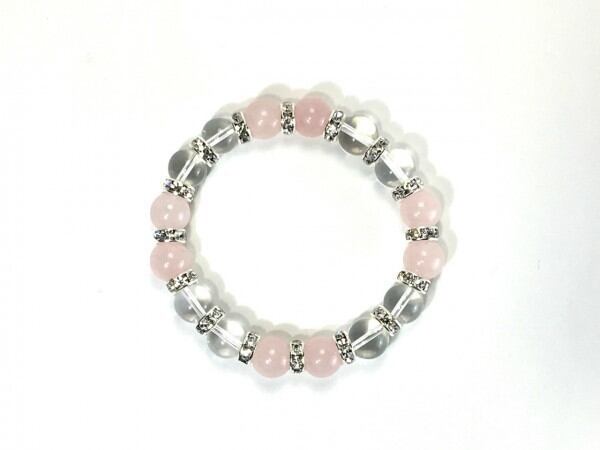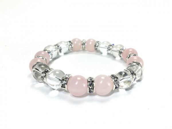 こちらは、ローズクォーツと水晶を組み合わせたブレスレットです。間にはロンデルを挟み高級感あるデザインに仕上がっています。石大きさは腕にも馴染みやすいように10mm玉で内周約16cm(伸可能)です。数に限りがございますので気になる方はお早めにどうぞ。