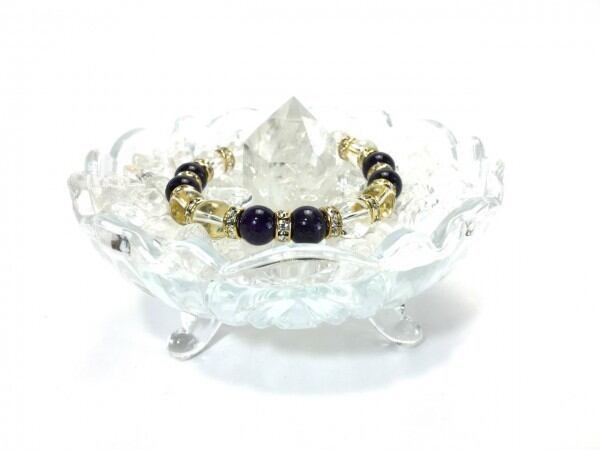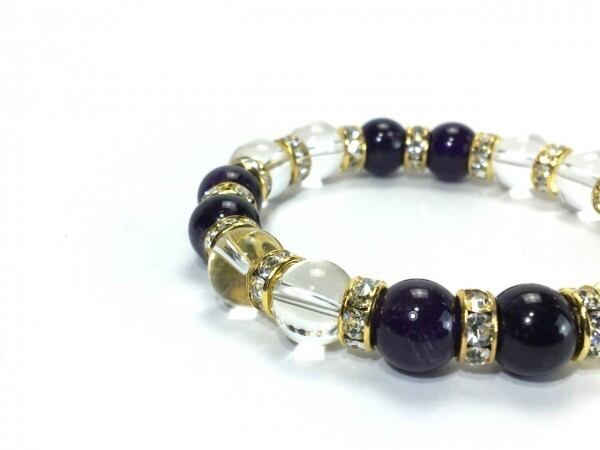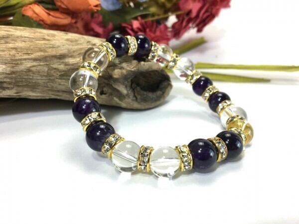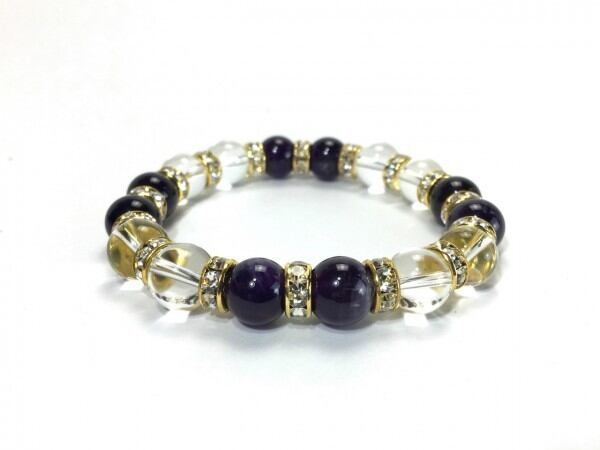 こちらは、アメジストと水晶を組み合わせたブレスレットです。間にはロンデルを挟み高級感あるデザインに仕上がっています。石大きさは腕にも馴染みやすいように10mm玉で内周約16cm(伸可能)です。数に限りがございますので気になる方はお早めにどうぞ。