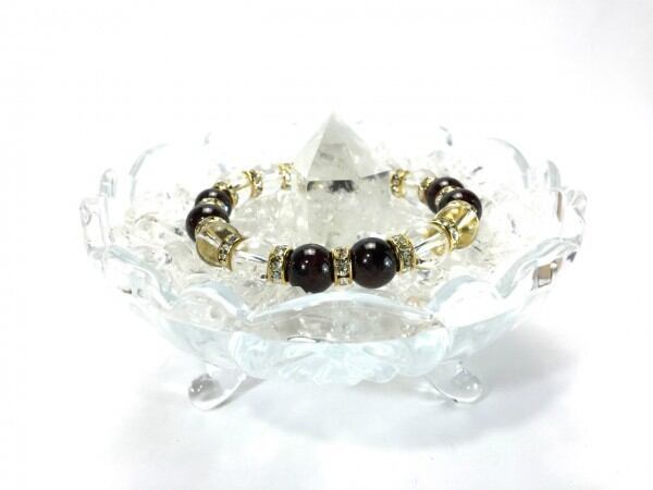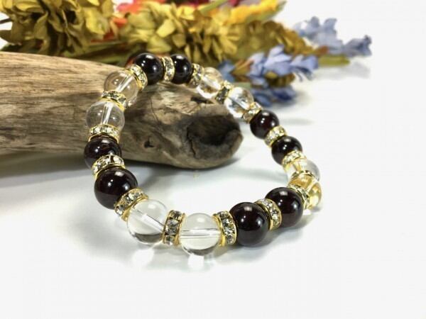 こちらは、ガーネットと水晶を組み合わせたブレスレットです。間にはロンデルを挟み高級感あるデザインに仕上がっています。石大きさは腕にも馴染みやすいように10mm玉で内周約16cm(伸可能)です。数に限りがございますので気になる方はお早めにどうぞ。