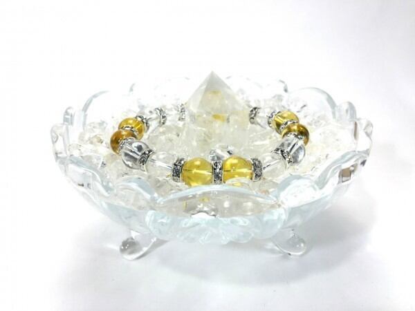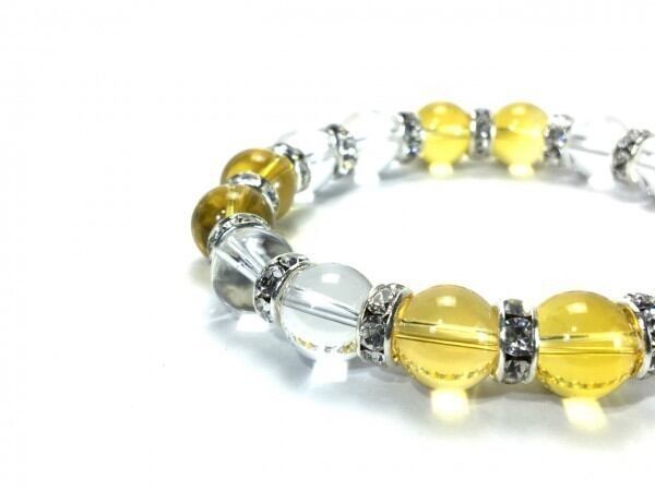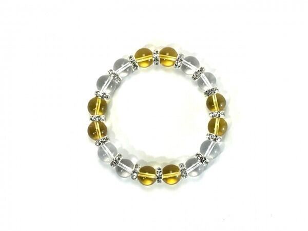 こちらは、シトリンと水晶を組み合わせたブレスレットです。間にはロンデルを挟み高級感あるデザインに仕上がっています。石大きさは腕にも馴染みやすいように10mm玉で内周約16cm(伸可能)です。数に限りがございますので気になる方はお早めにどうぞ。