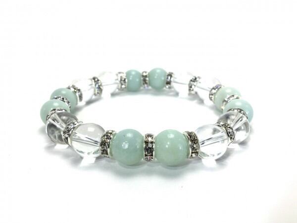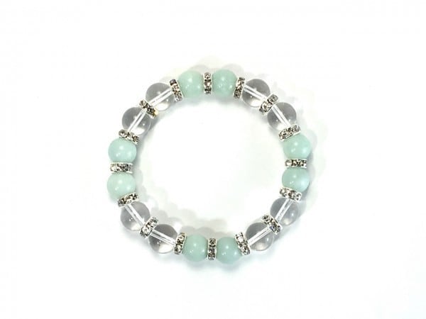 こちらは、アマゾナイトと水晶を組み合わせたブレスレットです。間にはロンデルを挟み高級感あるデザインに仕上がっています。石大きさは腕にも馴染みやすいように10mm玉で内周約16cm(伸可能)です。数に限りがございますので気になる方はお早めにどうぞ。