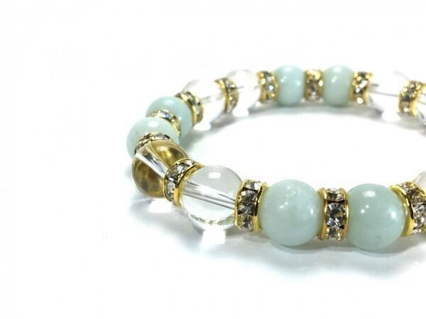 こちらは、アマゾナイトと水晶を組み合わせたブレスレットです。間にはロンデルを挟み高級感あるデザインに仕上がっています。石大きさは腕にも馴染みやすいように10mm玉で内周約16cm(伸可能)です。数に限りがございますので気になる方はお早めにどうぞ。