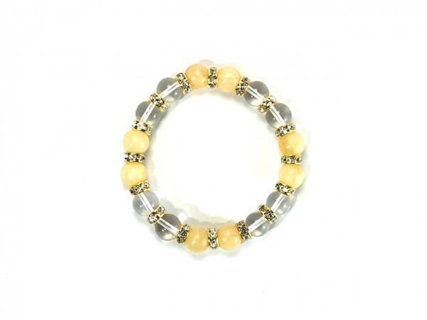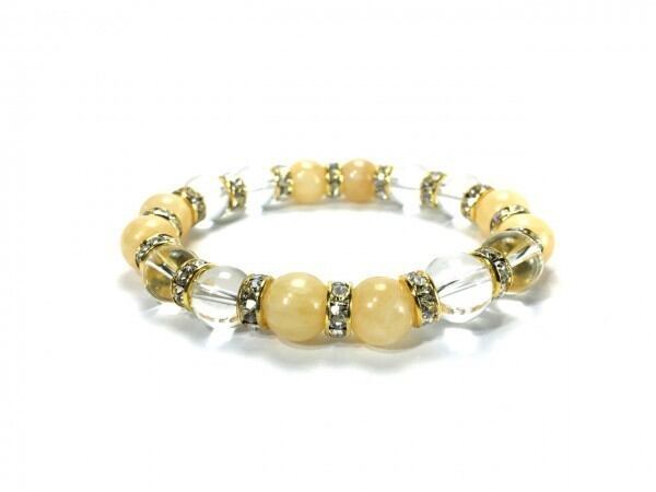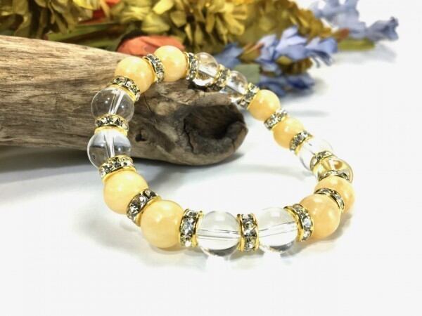 こちらは、アラゴナイトと水晶を組み合わせたブレスレットです。間にはロンデルを挟み高級感あるデザインに仕上がっています。石大きさは腕にも馴染みやすいように10mm玉で内周約16cm(伸可能)です。数に限りがございますので気になる方はお早めにどうぞ。