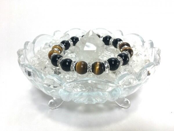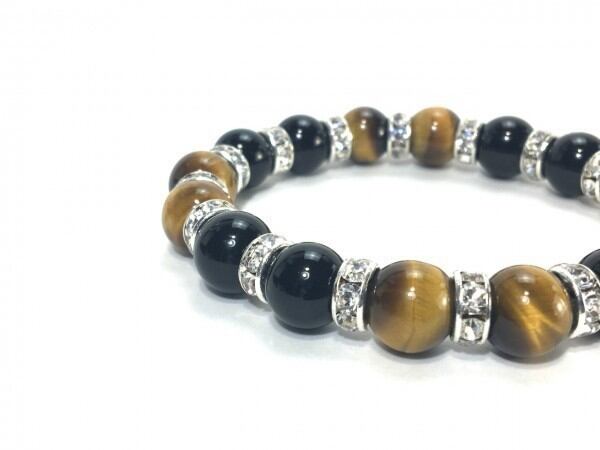 こちらは、タイガーアイとオニキスを組み合わせたブレスレットです。間にはロンデルを挟み高級感あるデザインに仕上がっています。石大きさは腕にも馴染みやすいように10mm玉で内周約16cm(伸可能)です。数に限りがございますので気になる方はお早めにどうぞ。
