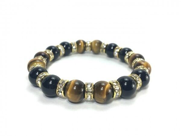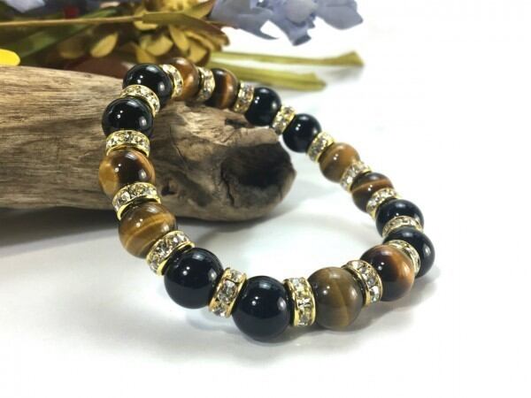 こちらは、タイガーアイとオニキスを組み合わせたブレスレットです。間にはロンデルを挟み高級感あるデザインに仕上がっています。石大きさは腕にも馴染みやすいように10mm玉で内周約16cm(伸可能)です。数に限りがございますので気になる方はお早めにどうぞ。