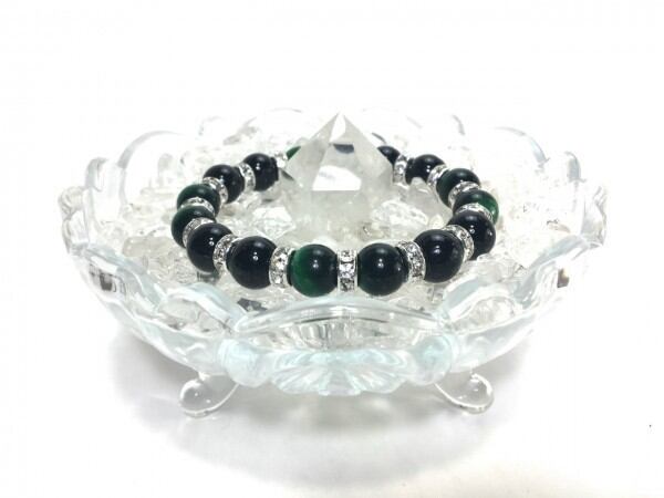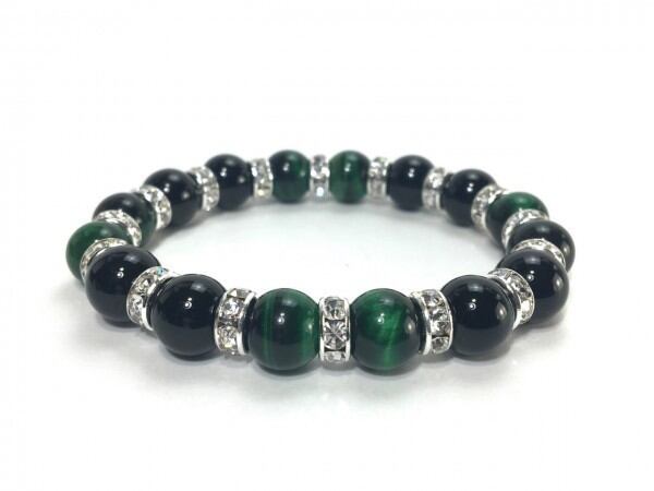 こちらは、グリーンタイガーアイとオニキスを組み合わせたブレスレットです。間にはロンデルを挟み高級感あるデザインに仕上がっています。石大きさは腕にも馴染みやすいように10mm玉で内周約16cm(伸可能)です。数に限りがございますので気になる方はお早めにどうぞ。