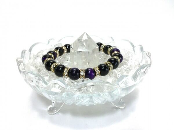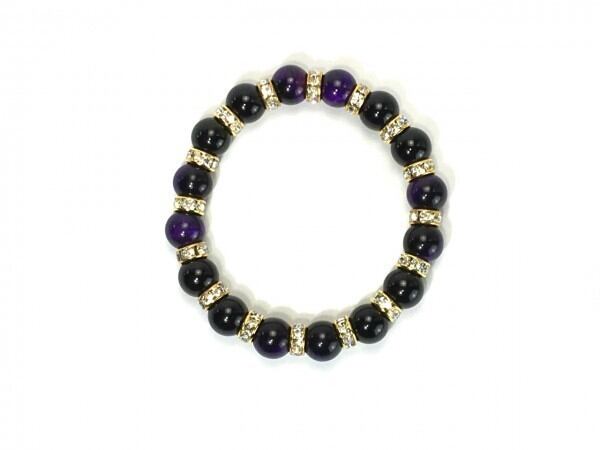 こちらは、パープルタイガーアイとオニキスを組み合わせたブレスレットです。間にはロンデルを挟み高級感あるデザインに仕上がっています。石大きさは腕にも馴染みやすいように10mm玉で内周約16cm(伸可能)です。数に限りがございますので気になる方はお早めにどうぞ。