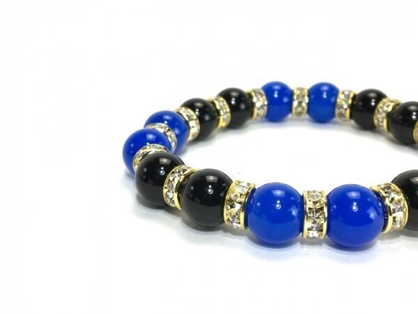 こちらは、ブルーメノウとオニキスを組み合わせたブレスレットです。間にはロンデルを挟み高級感あるデザインに仕上がっています。石大きさは腕にも馴染みやすいように10mm玉で内周約16cm(伸可能)です。数に限りがございますので気になる方はお早めにどうぞ。