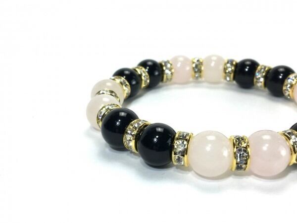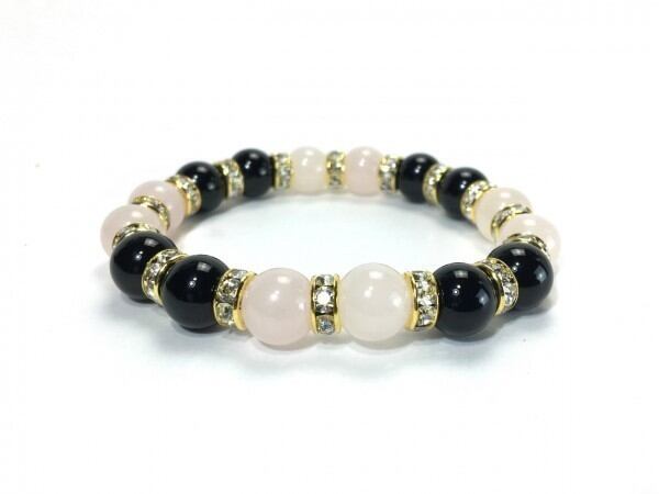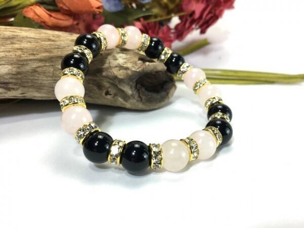 こちらは、ローズクォーツとオニキスを組み合わせたブレスレットです。間にはロンデルを挟み高級感あるデザインに仕上がっています。石大きさは腕にも馴染みやすいように10mm玉で内周約16cm(伸可能)です。数に限りがございますので気になる方はお早めにどうぞ。