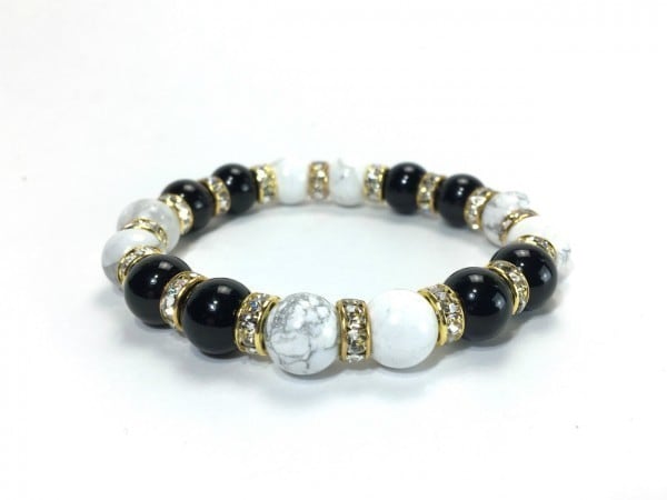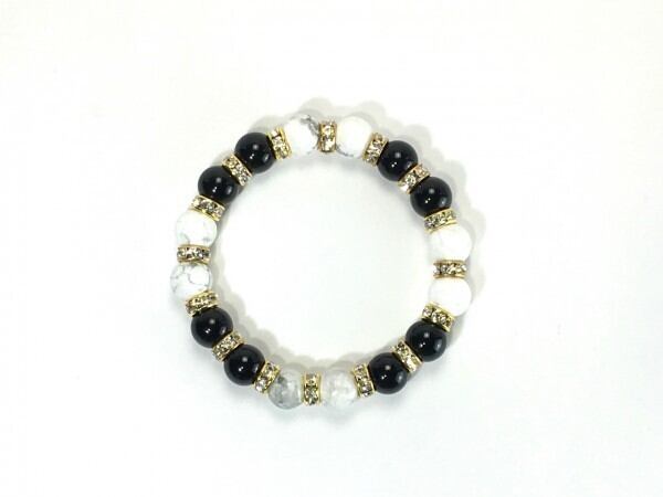 こちらは、ハウライトとオニキスを組み合わせたブレスレットです。間にはロンデルを挟み高級感あるデザインに仕上がっています。石大きさは腕にも馴染みやすいように10mm玉で内周約16cm(伸可能)です。数に限りがございますので気になる方はお早めにどうぞ。