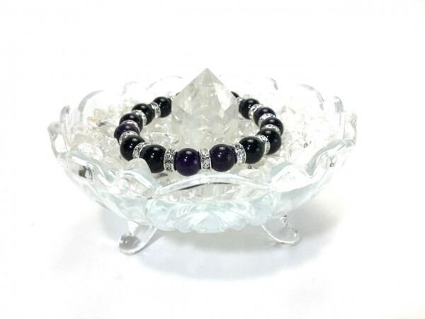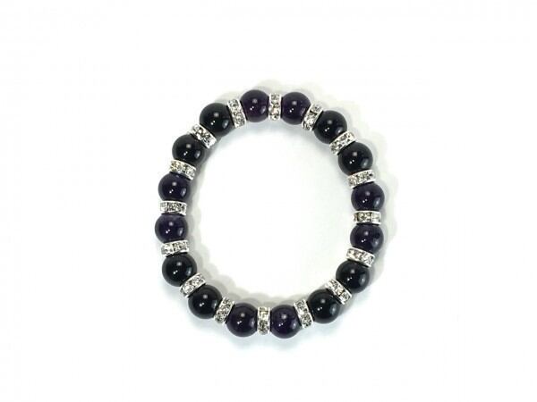 こちらは、アメジストとオニキスを組み合わせたブレスレットです。間にはロンデルを挟み高級感あるデザインに仕上がっています。石大きさは腕にも馴染みやすいように10mm玉で内周約16cm(伸可能)です。数に限りがございますので気になる方はお早めにどうぞ。