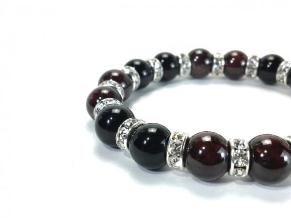 こちらは、ガーネットとオニキスを組み合わせたブレスレットです。間にはロンデルを挟み高級感あるデザインに仕上がっています。石大きさは腕にも馴染みやすいように10mm玉で内周約16cm(伸可能)です。数に限りがございますので気になる方はお早めにどうぞ。