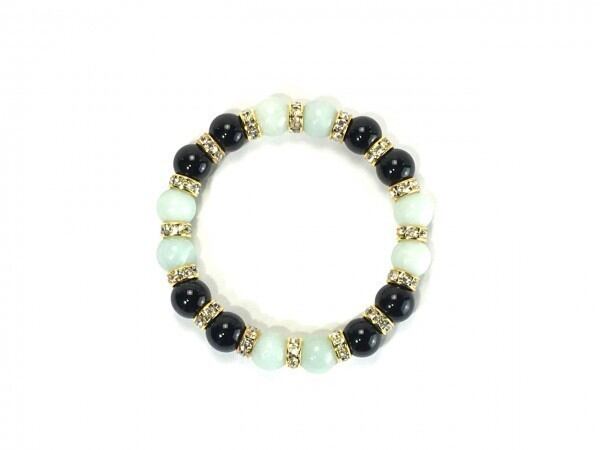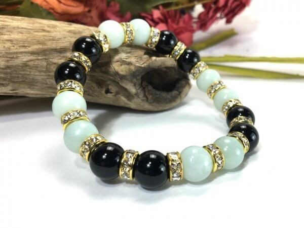 こちらは、アマゾナイトとオニキスを組み合わせたブレスレットです。間にはロンデルを挟み高級感あるデザインに仕上がっています。石大きさは腕にも馴染みやすいように10mm玉で内周約16cm(伸可能)です。数に限りがございますので気になる方はお早めにどうぞ。
