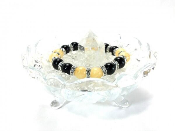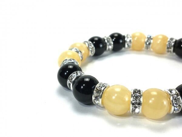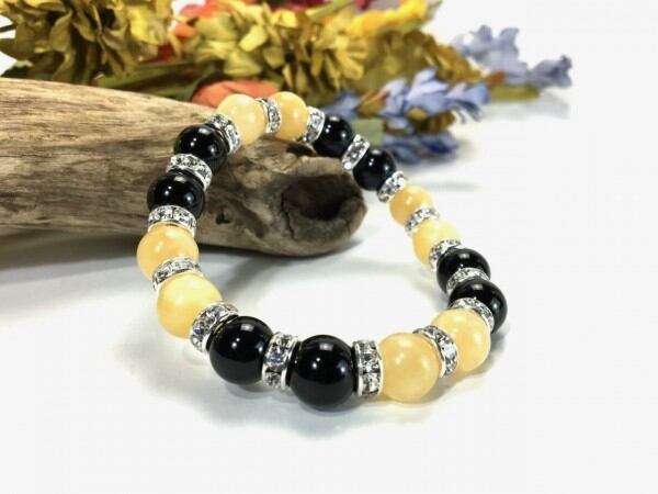こちらは、アラゴナイトとオニキスを組み合わせたブレスレットです。間にはロンデルを挟み高級感あるデザインに仕上がっています。石大きさは腕にも馴染みやすいように10mm玉で内周約16cm(伸可能)です。数に限りがございますので気になる方はお早めにどうぞ。