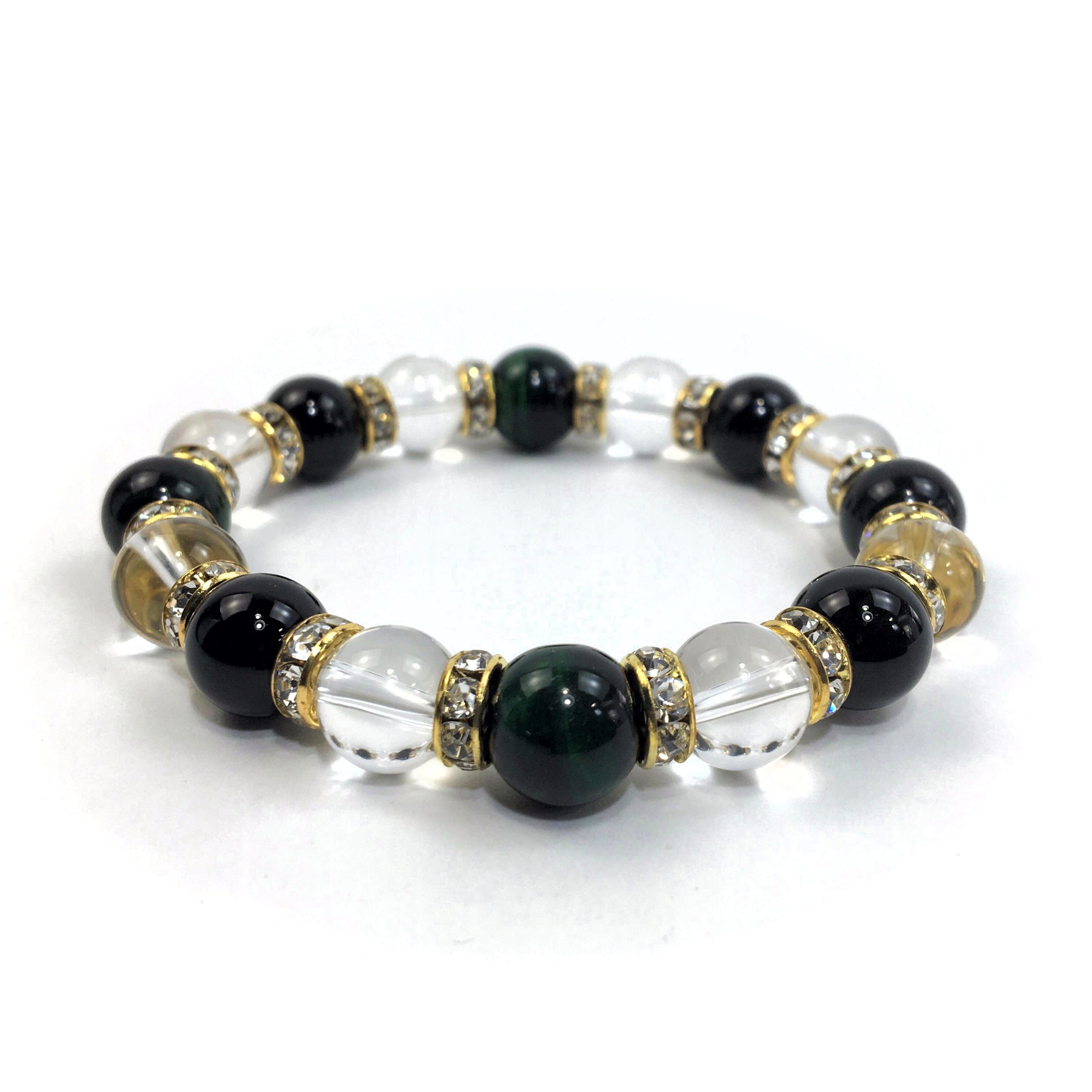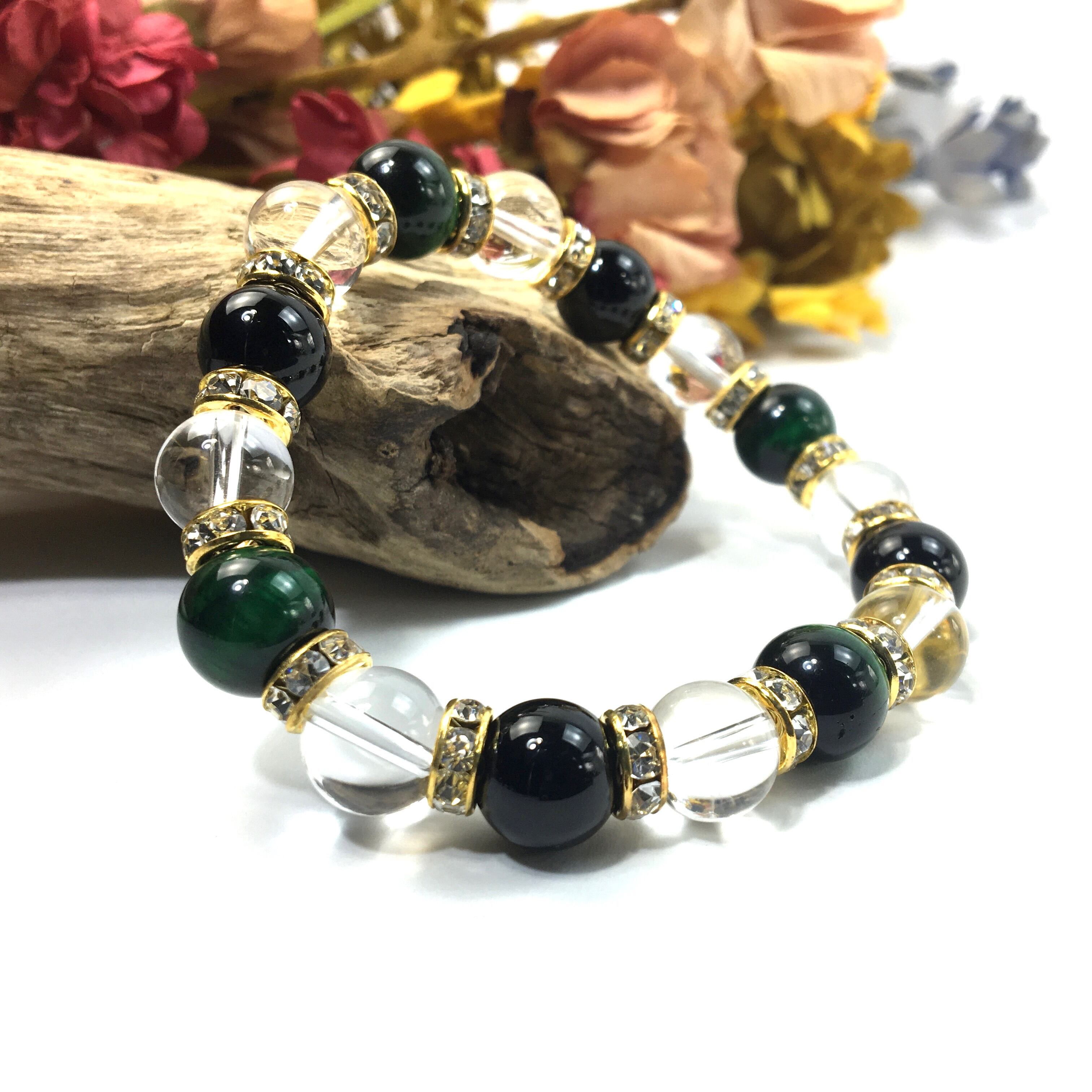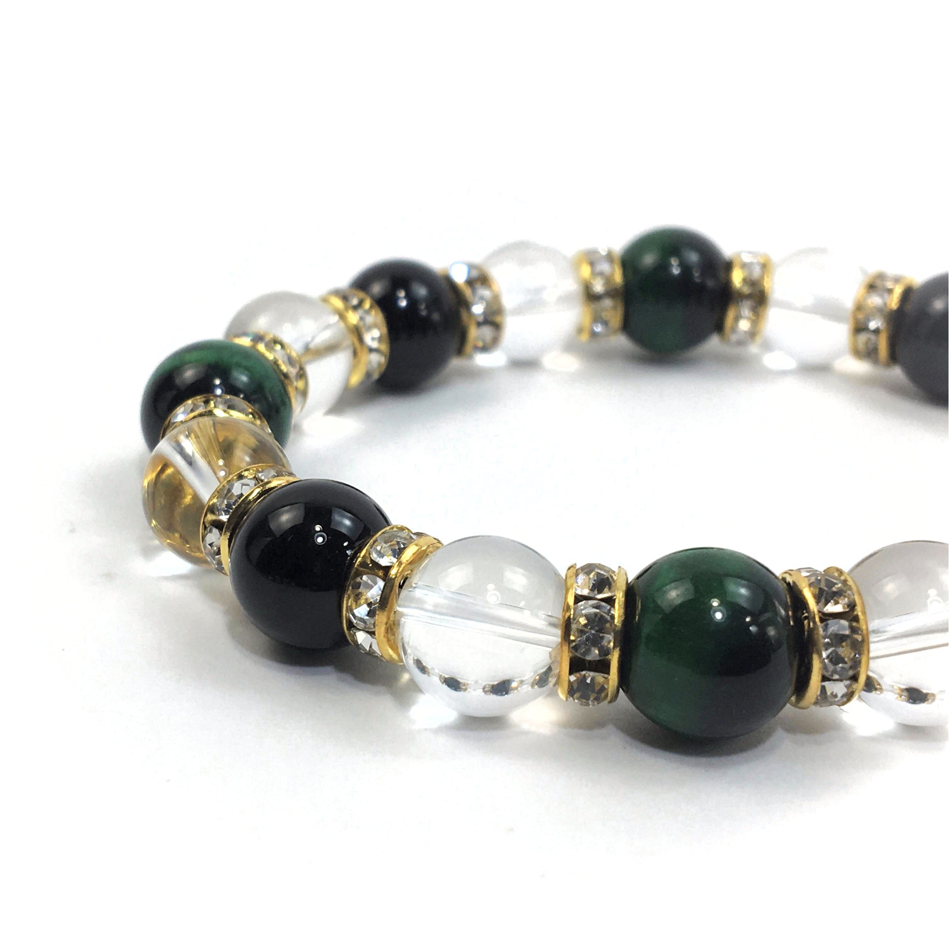 グリーンタイガーアイ×水晶×オニキス パワーストーン ブレスレット 10mm(ゴールド)メンズ・レディース 男性・女性 数珠ブレス 開運 ☆