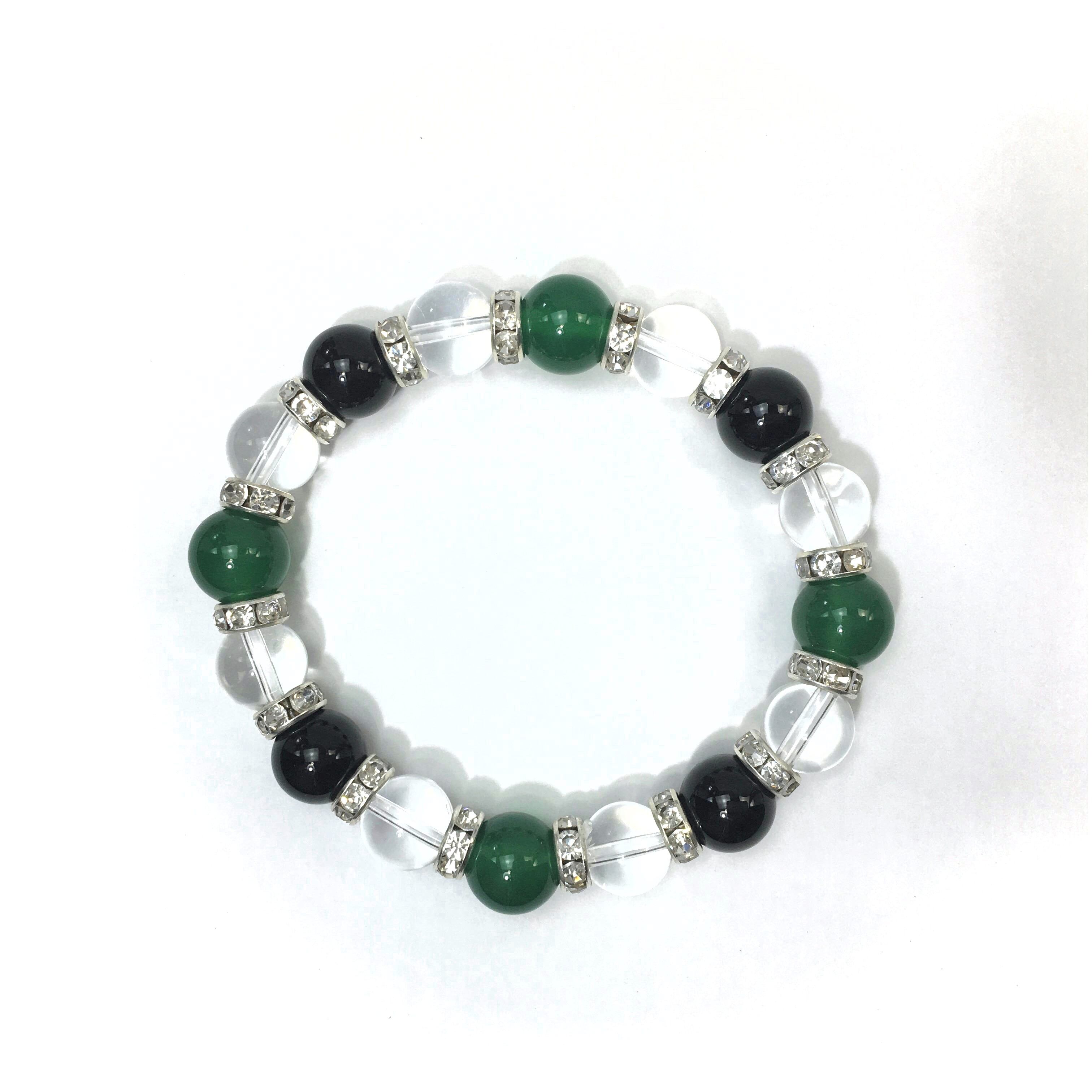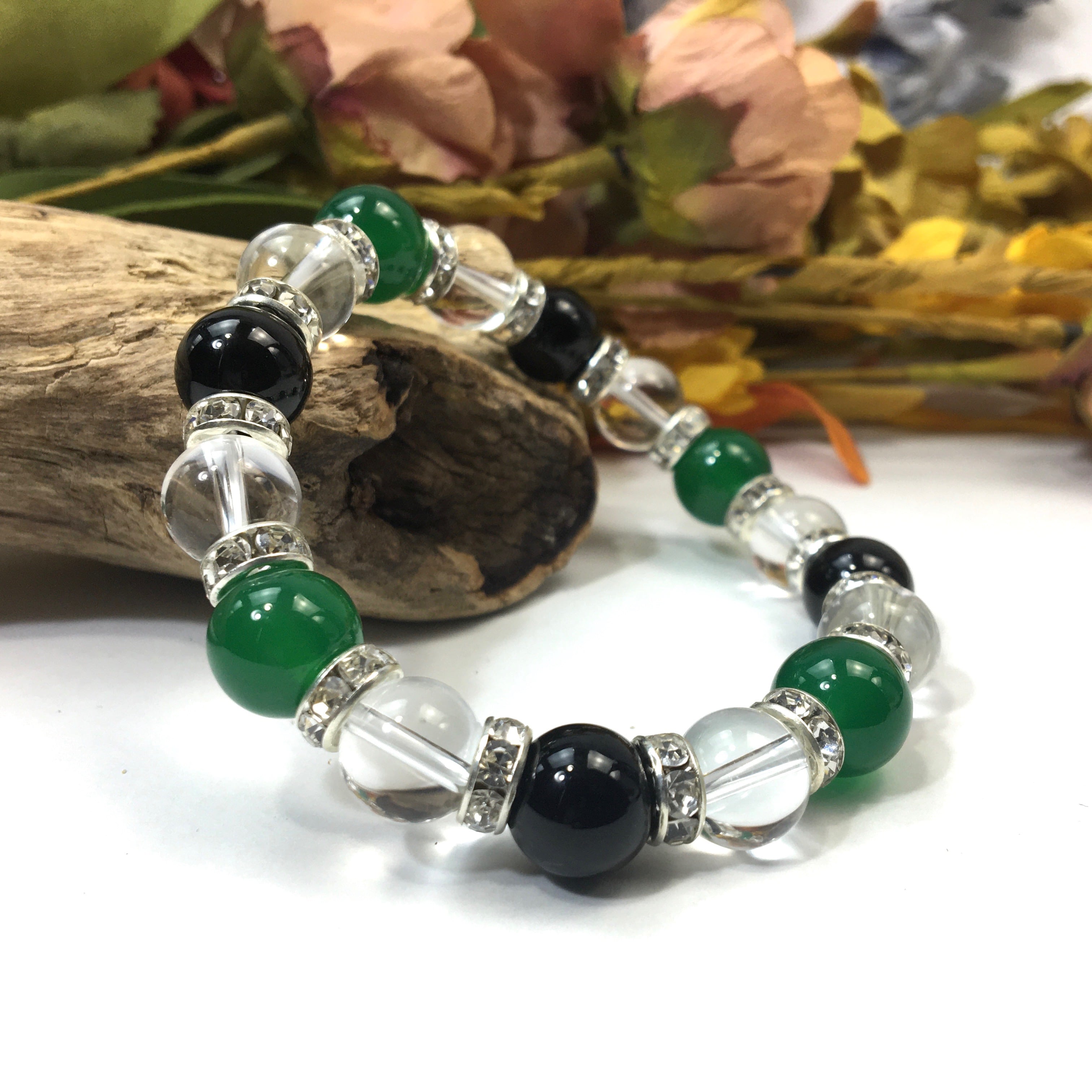 こちらは、緑瑪瑙と水晶とオニキスを組み合わせたブレスレットです。間にはロンデルを挟み高級感あるデザインに仕上がっています。石大きさは腕にも馴染みやすいように10mm玉で内周約16cmです。数に限りがございますので気になる方はお早めにどうぞ。