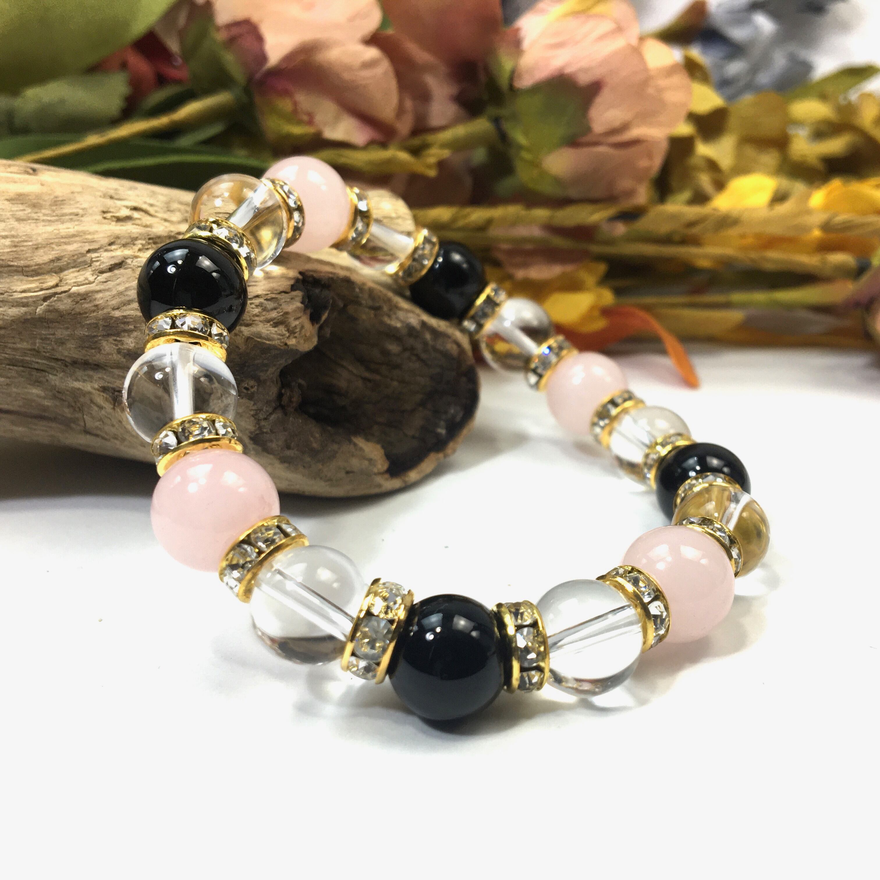 こちらは、ローズクォーツと水晶とオニキスを組み合わせたブレスレットです。間にはロンデルを挟み高級感あるデザインに仕上がっています。石大きさは腕にも馴染みやすいように10mm玉で内周約16cmです。数に限りがございますので気になる方はお早めにどうぞ。