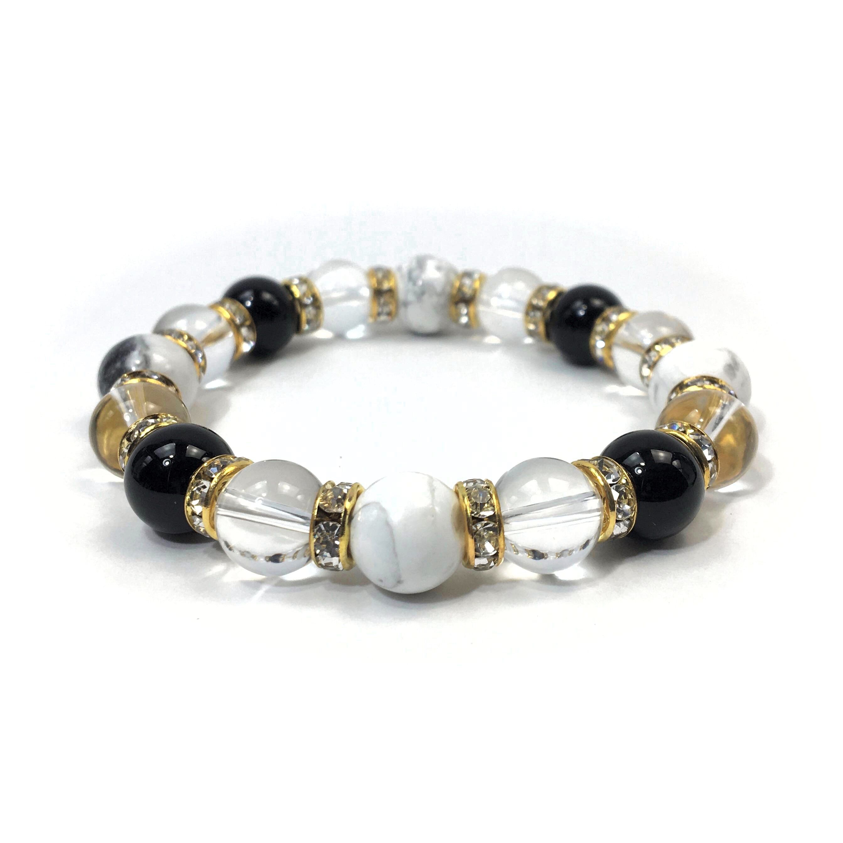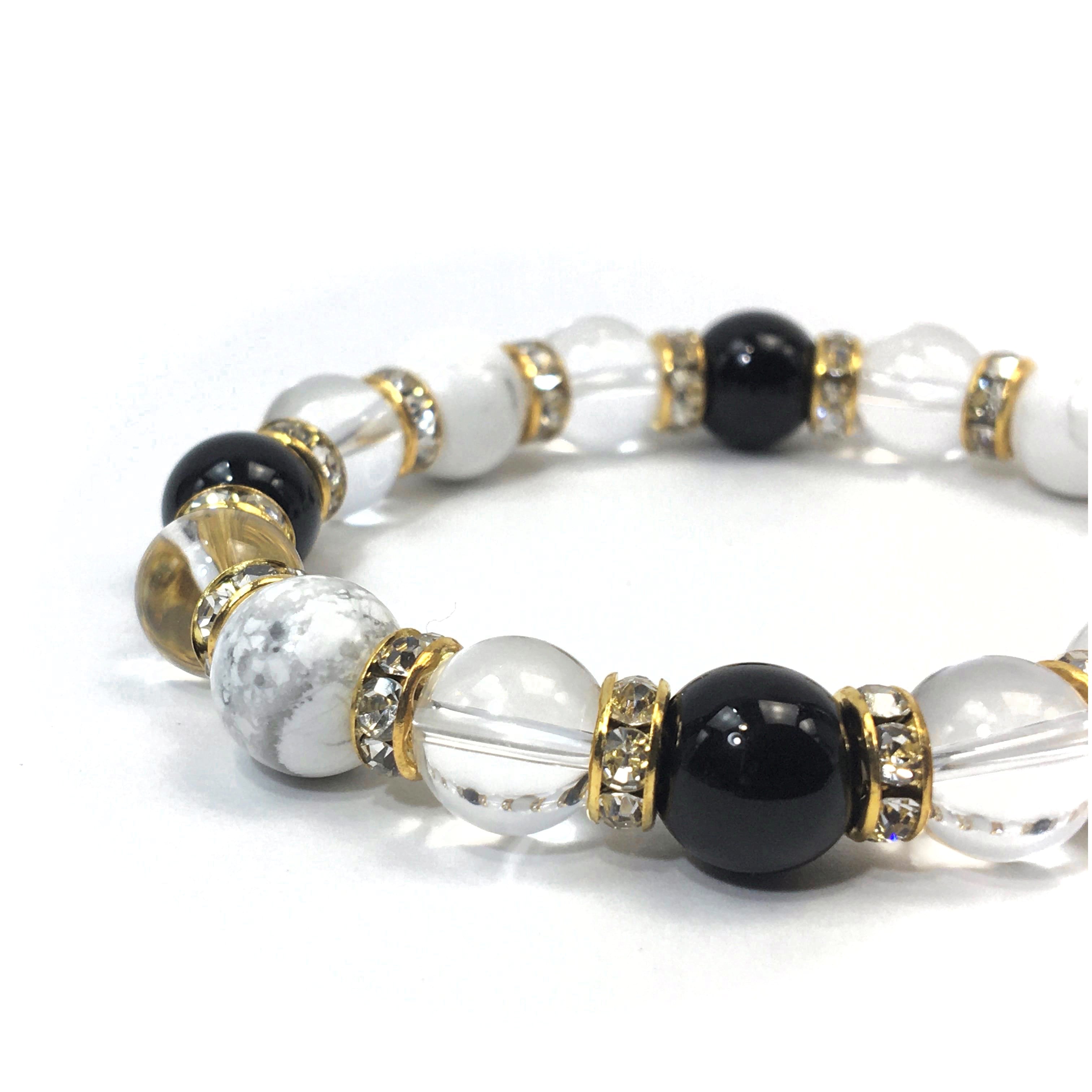 ハウライト×水晶×オニキス パワーストーン ブレスレット 10mm(ゴールド)メンズ・レディース 男性・女性 数珠ブレス 開運 ☆