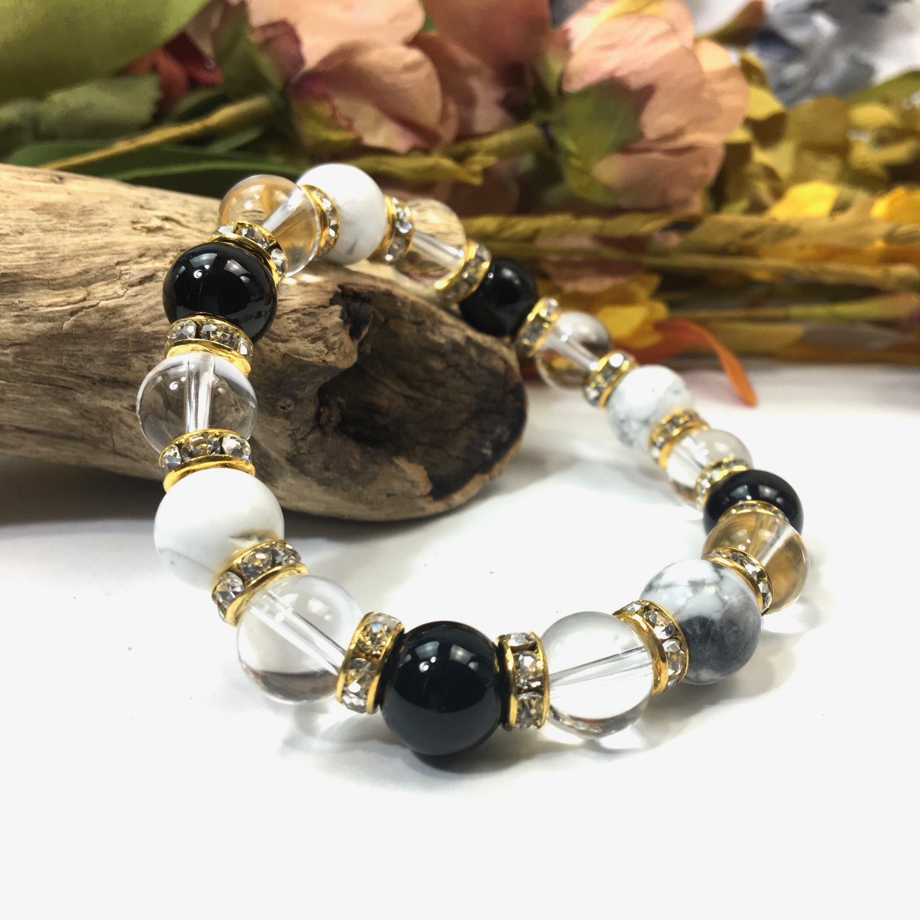 こちらは、ハウライトと水晶とオニキスを組み合わせたブレスレットです。間にはロンデルを挟み高級感あるデザインに仕上がっています。石大きさは腕にも馴染みやすいように10mm玉で内周約16cmです。数に限りがございますので気になる方はお早めにどうぞ。