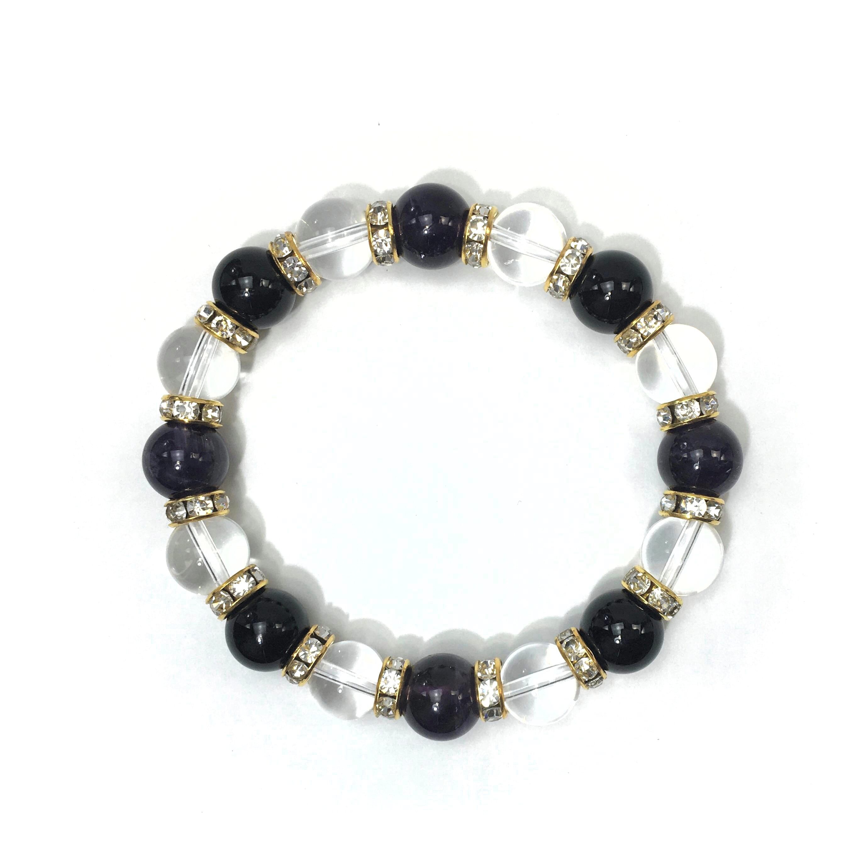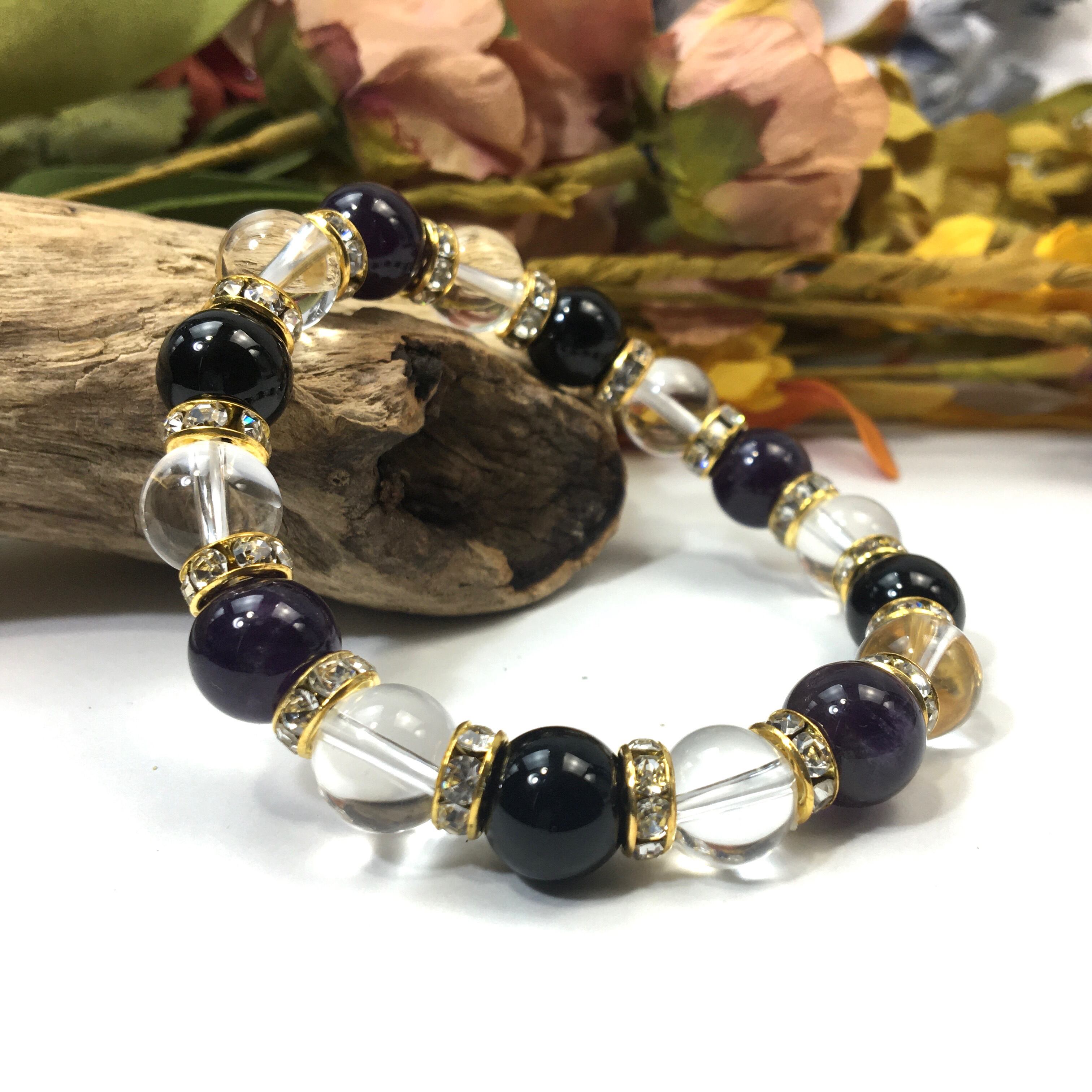 こちらは、アメジストと水晶とオニキスを組み合わせたブレスレットです。間にはロンデルを挟み高級感あるデザインに仕上がっています。石大きさは腕にも馴染みやすいように10mm玉で内周約16cmです。数に限りがございますので気になる方はお早めにどうぞ。