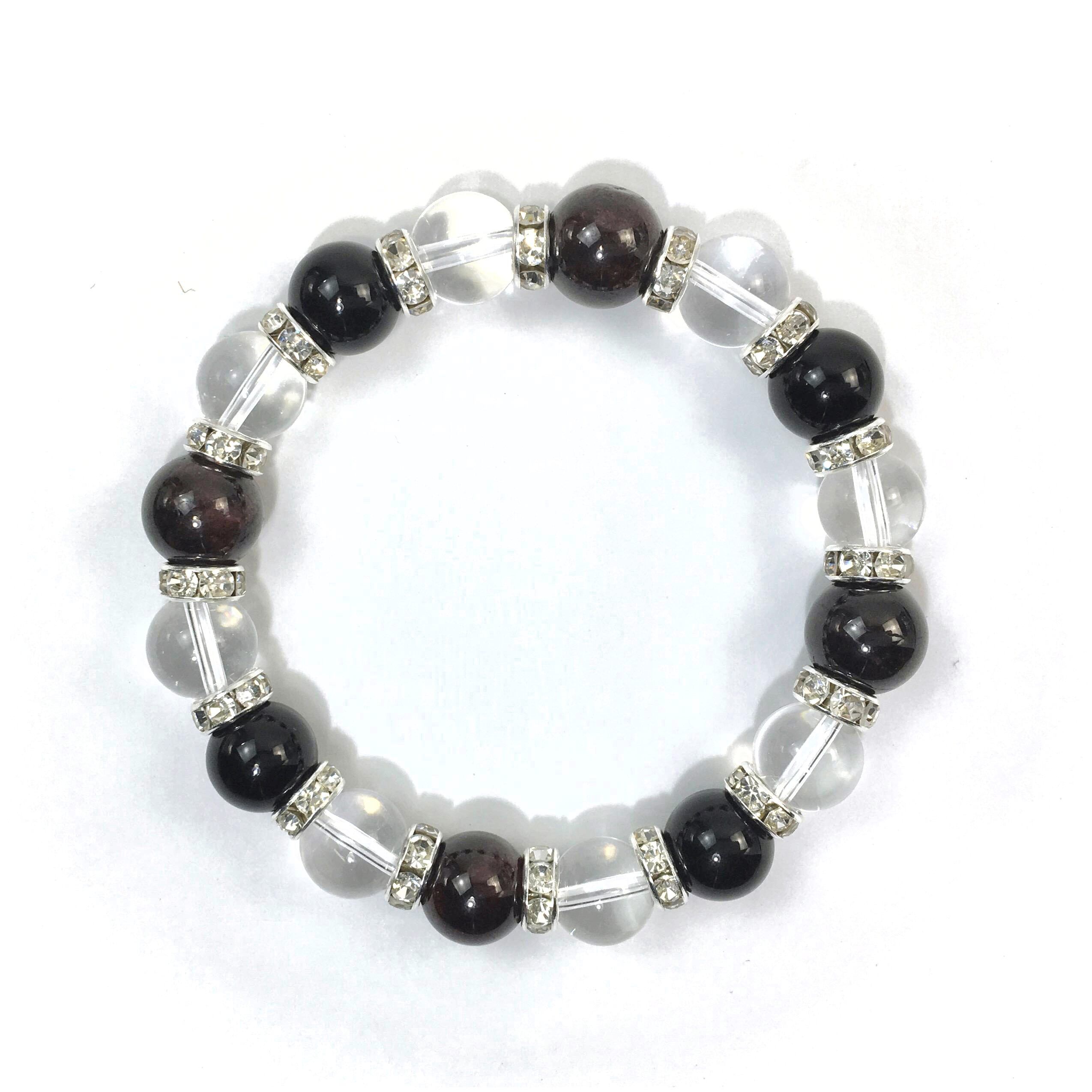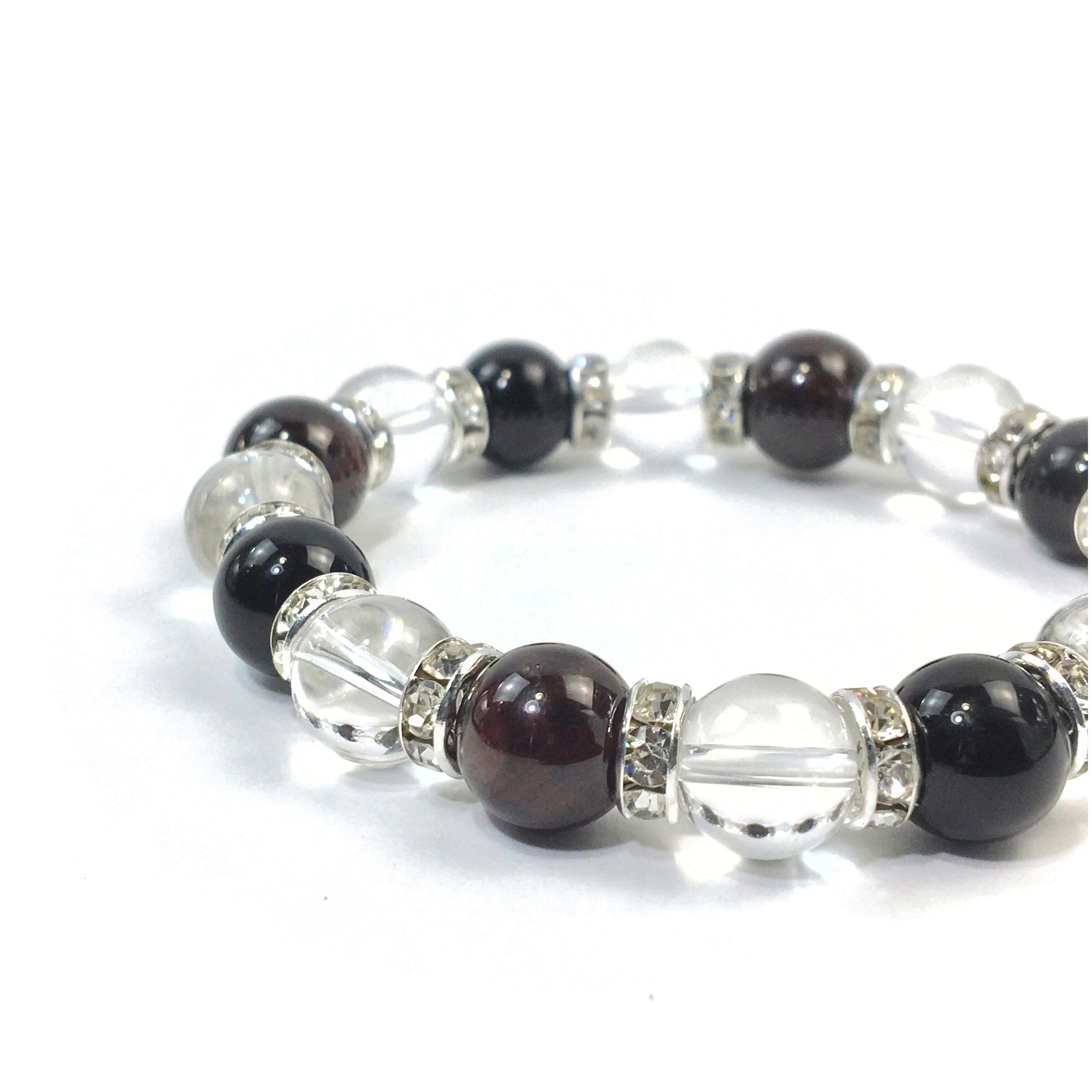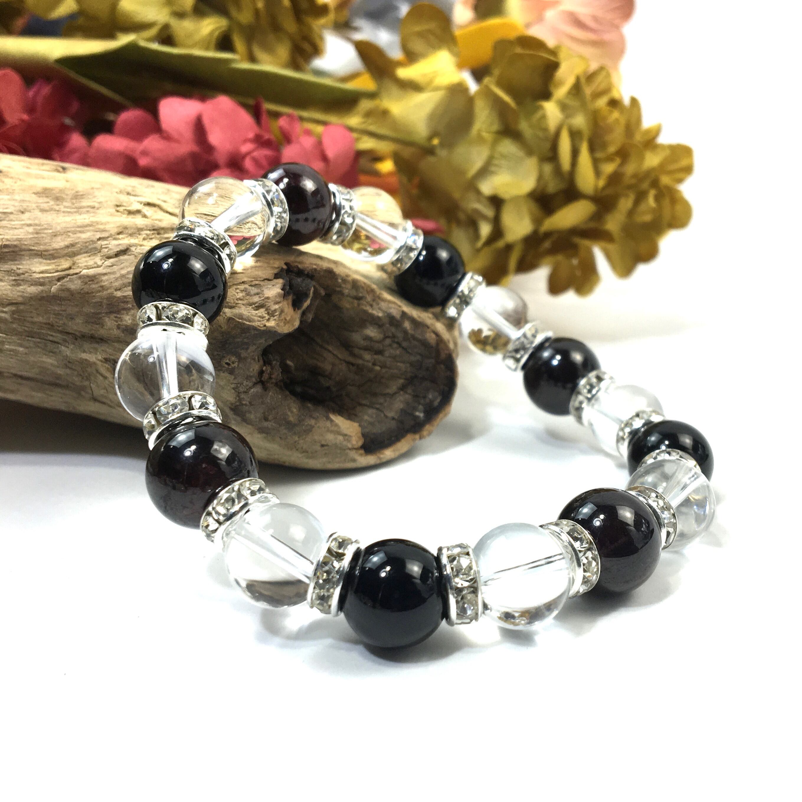 こちらは、ガーネットと水晶とオニキスを組み合わせたブレスレットです。間にはロンデルを挟み高級感あるデザインに仕上がっています。石大きさは腕にも馴染みやすいように10mm玉で内周約16cmです。数に限りがございますので気になる方はお早めにどうぞ。