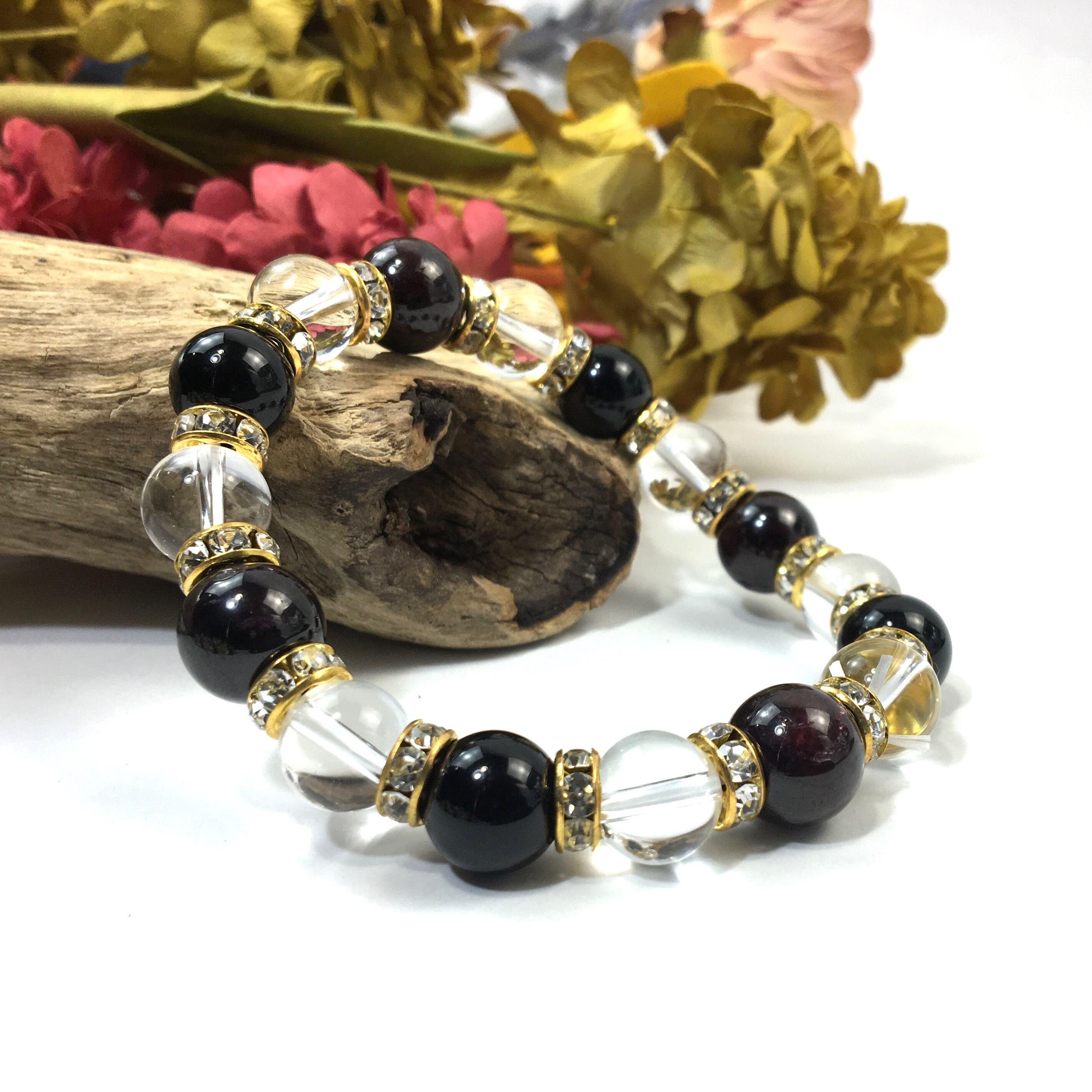 こちらは、ガーネットと水晶とオニキスを組み合わせたブレスレットです。間にはロンデルを挟み高級感あるデザインに仕上がっています。石大きさは腕にも馴染みやすいように10mm玉で内周約16cmです。数に限りがございますので気になる方はお早めにどうぞ。