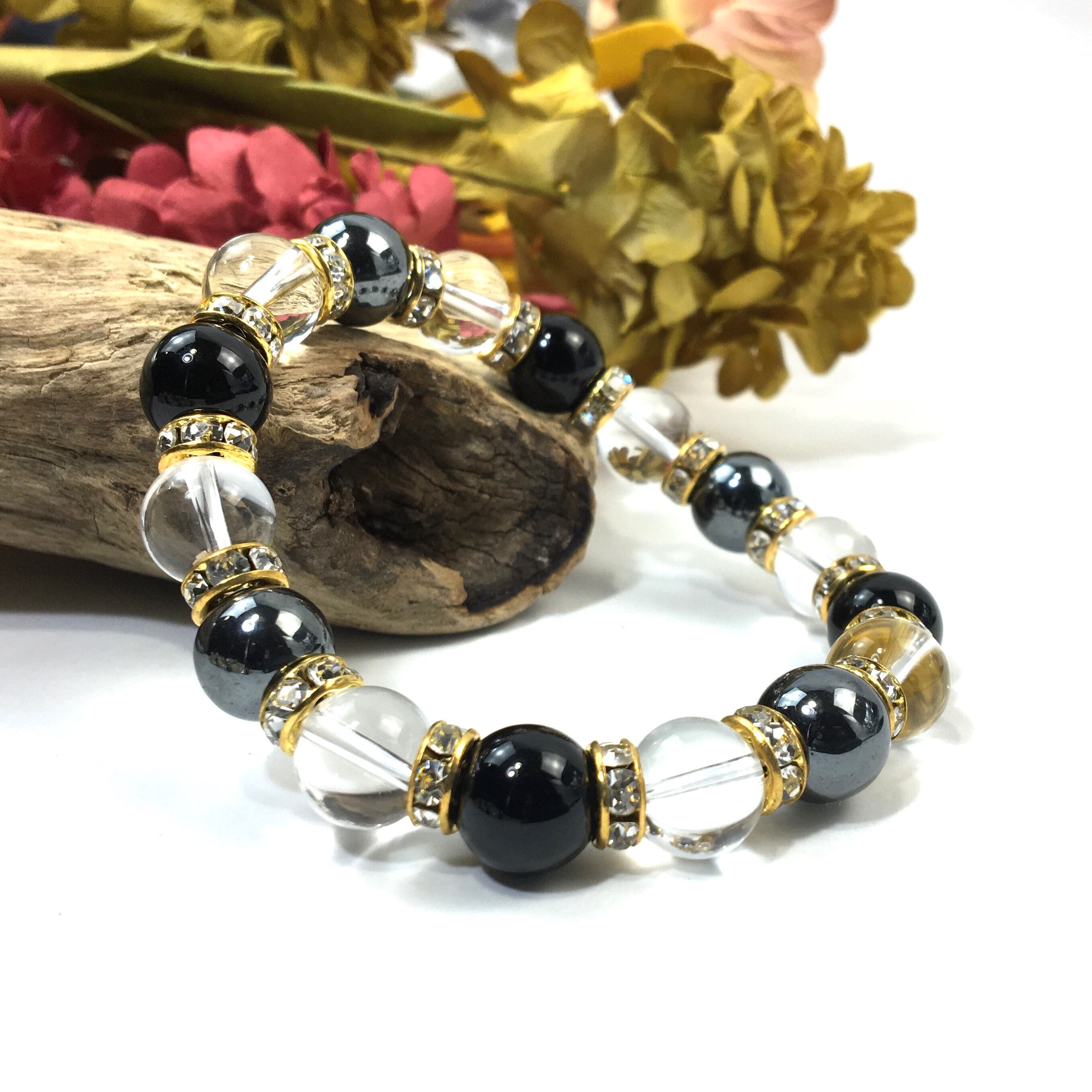 こちらは、ヘマタイトと水晶とオニキスを組み合わせたブレスレットです。間にはロンデルを挟み高級感あるデザインに仕上がっています。石大きさは腕にも馴染みやすいように10mm玉で内周約16cmです。数に限りがございますので気になる方はお早めにどうぞ。