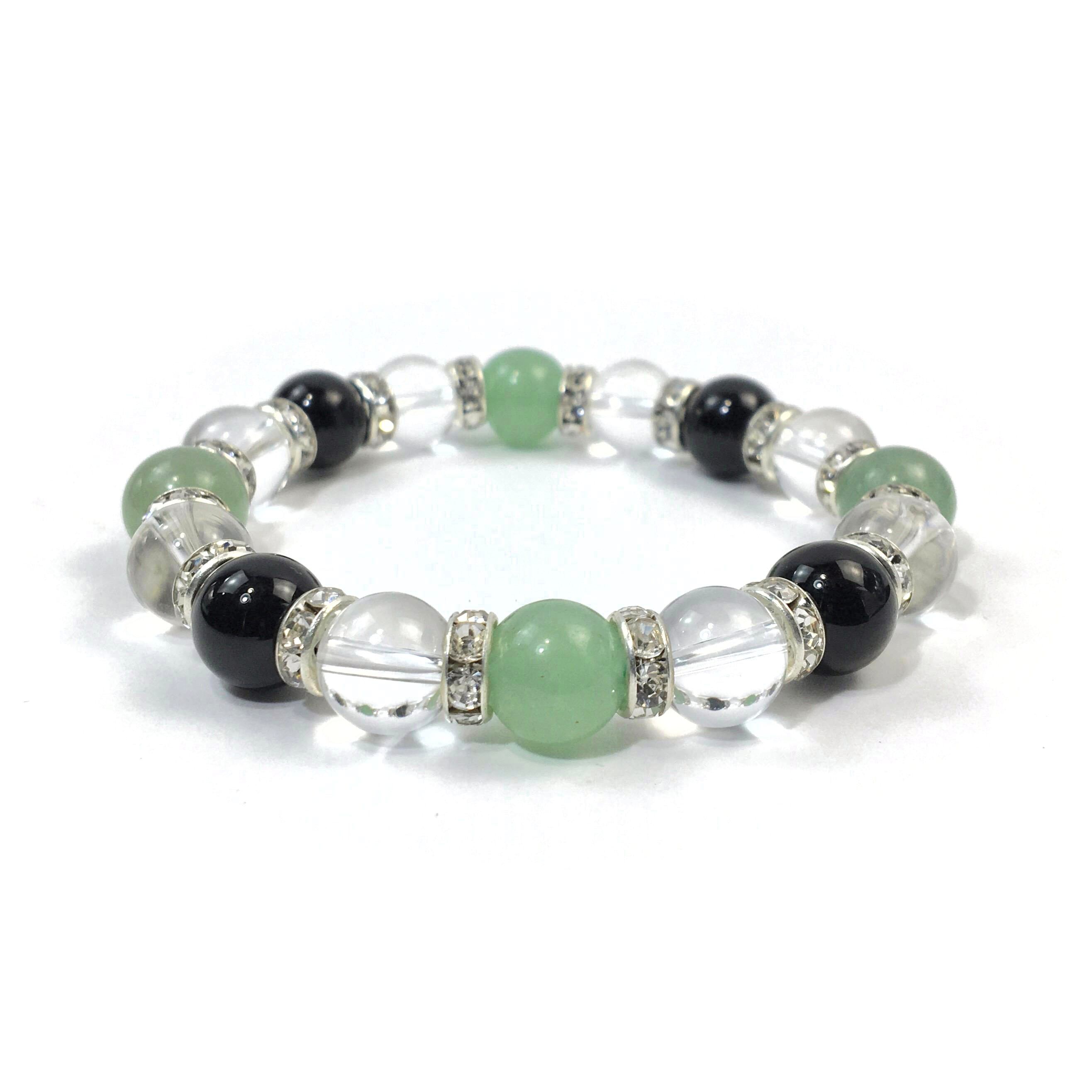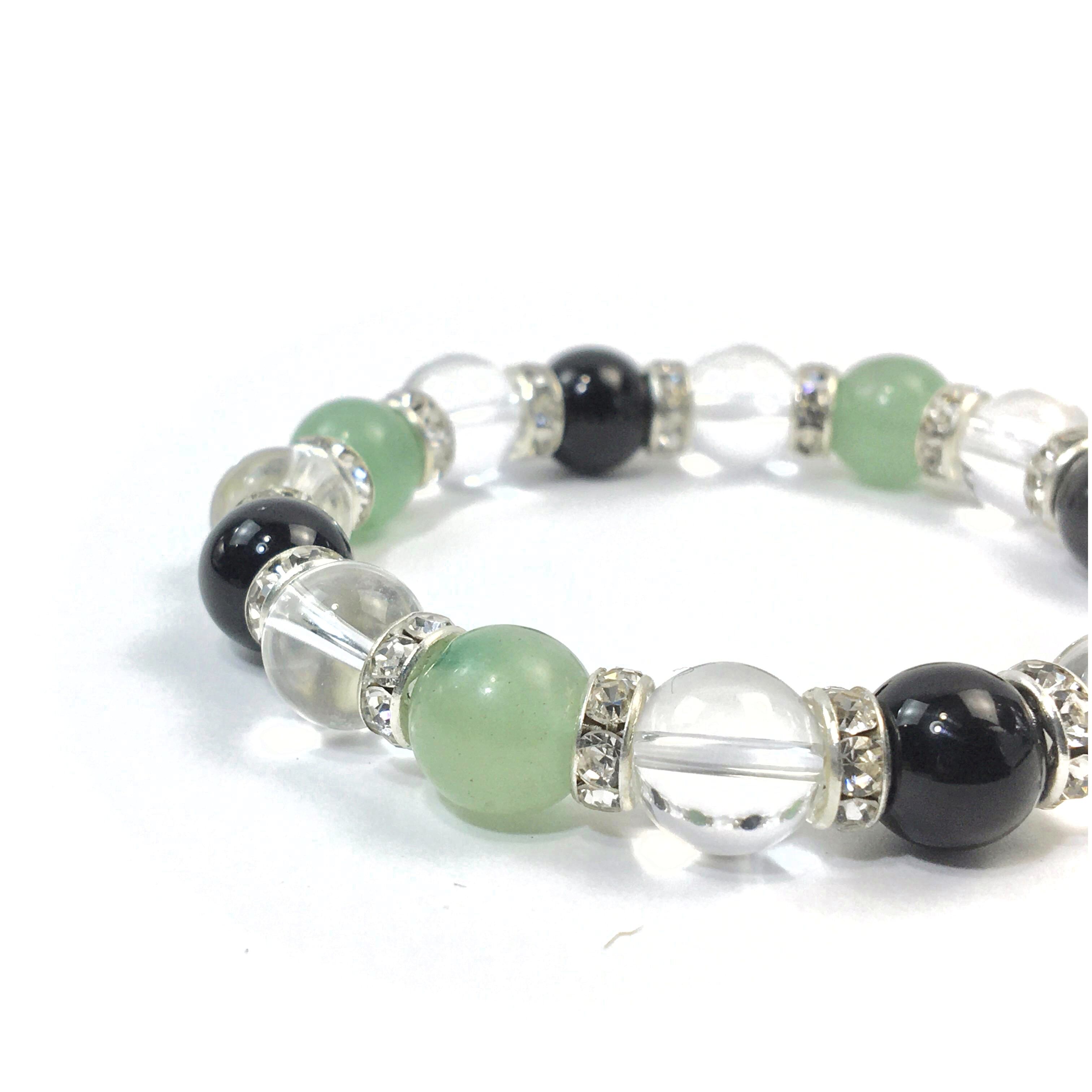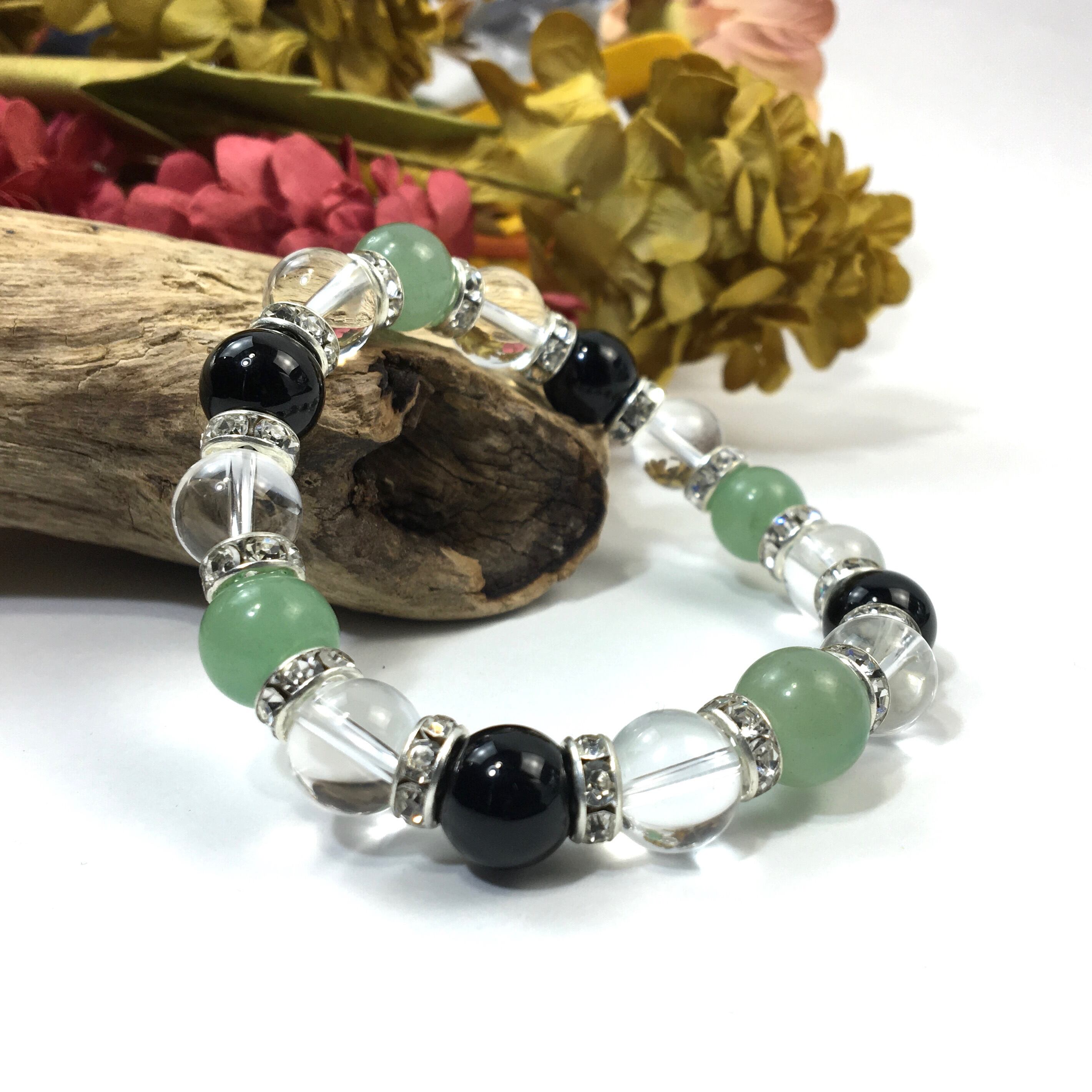 こちらは、アベンチュリンと水晶とオニキスを組み合わせたブレスレットです。間にはロンデルを挟み高級感あるデザインに仕上がっています。石大きさは腕にも馴染みやすいように10mm玉で内周約16cmです。数に限りがございますので気になる方はお早めにどうぞ。