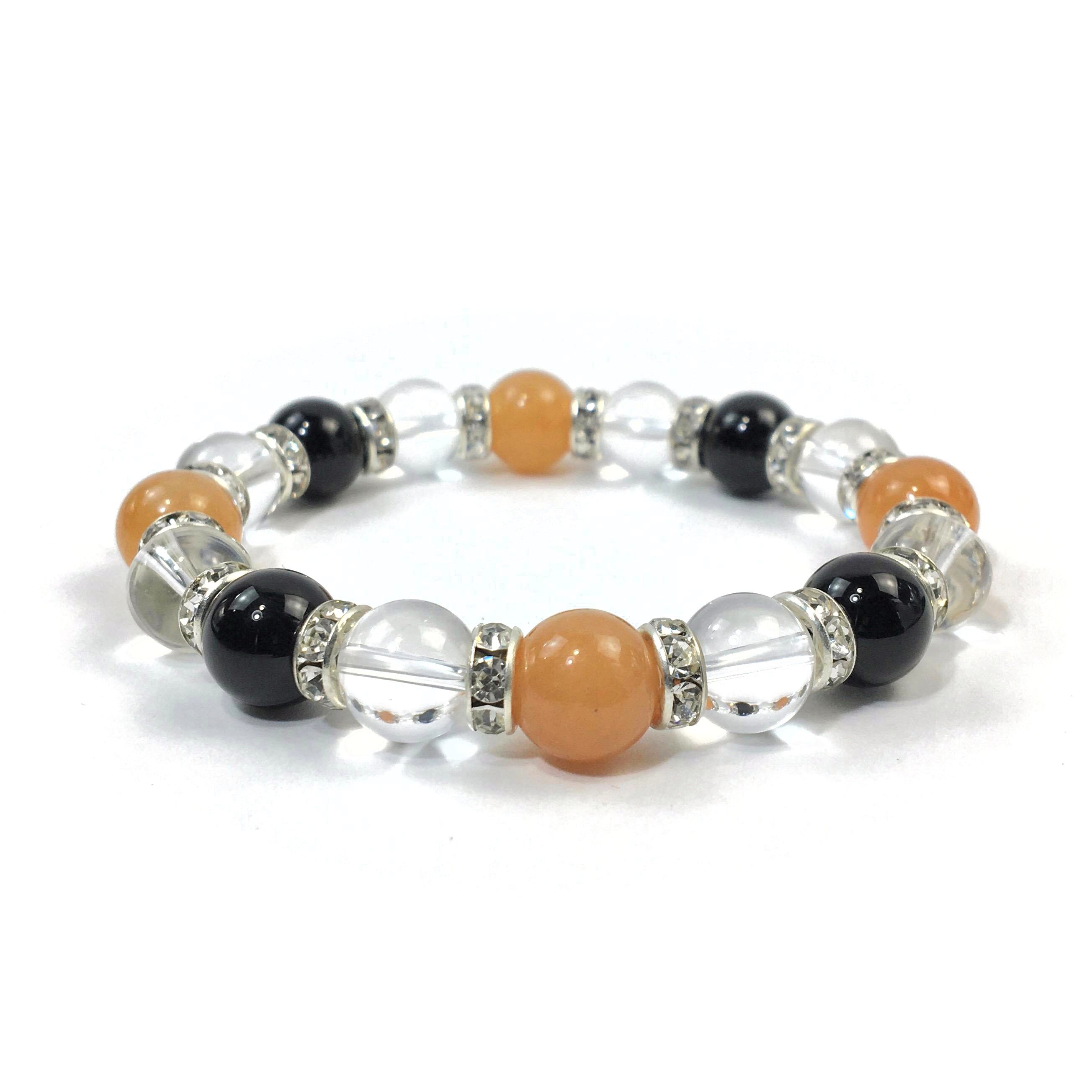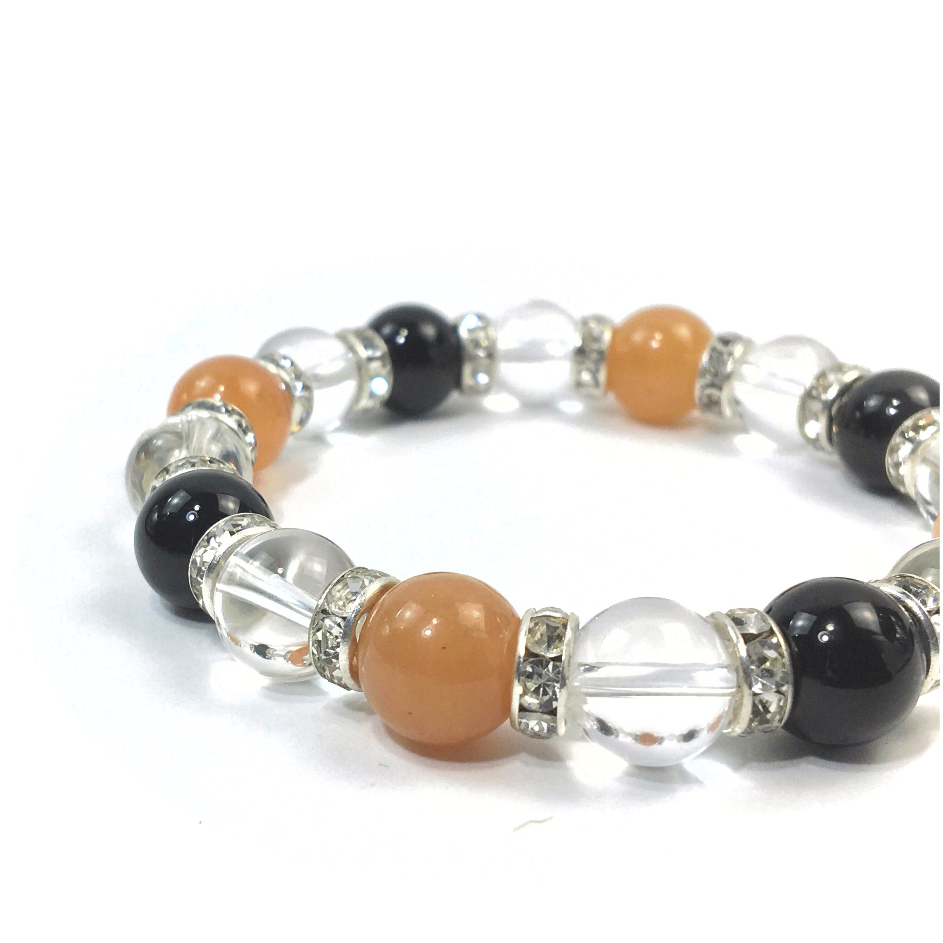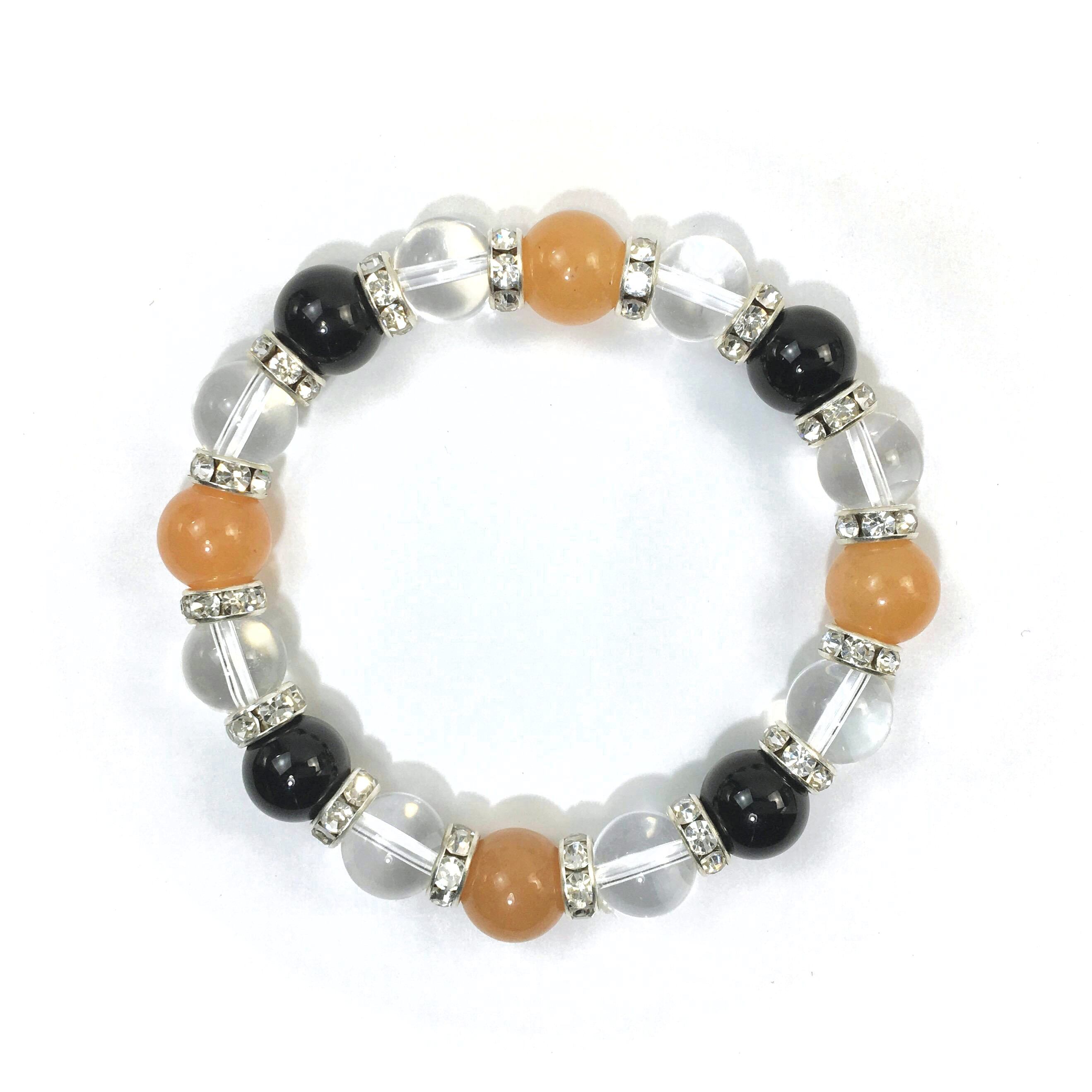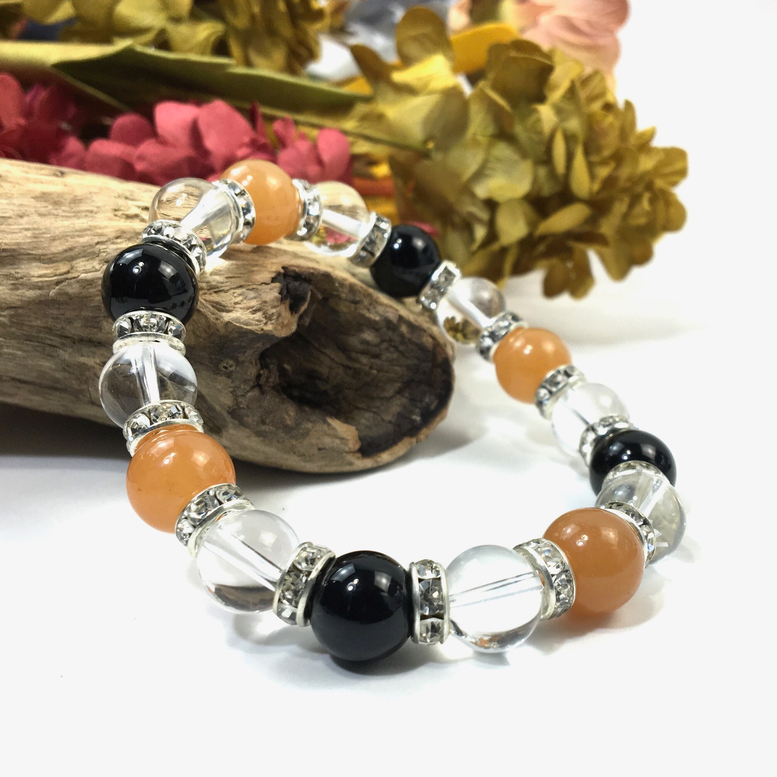 こちらは、レッドアベンチュリンと水晶とオニキスを組み合わせたブレスレットです。間にはロンデルを挟み高級感あるデザインに仕上がっています。石大きさは腕にも馴染みやすいように10mm玉で内周約16cmです。数に限りがございますので気になる方はお早めにどうぞ。