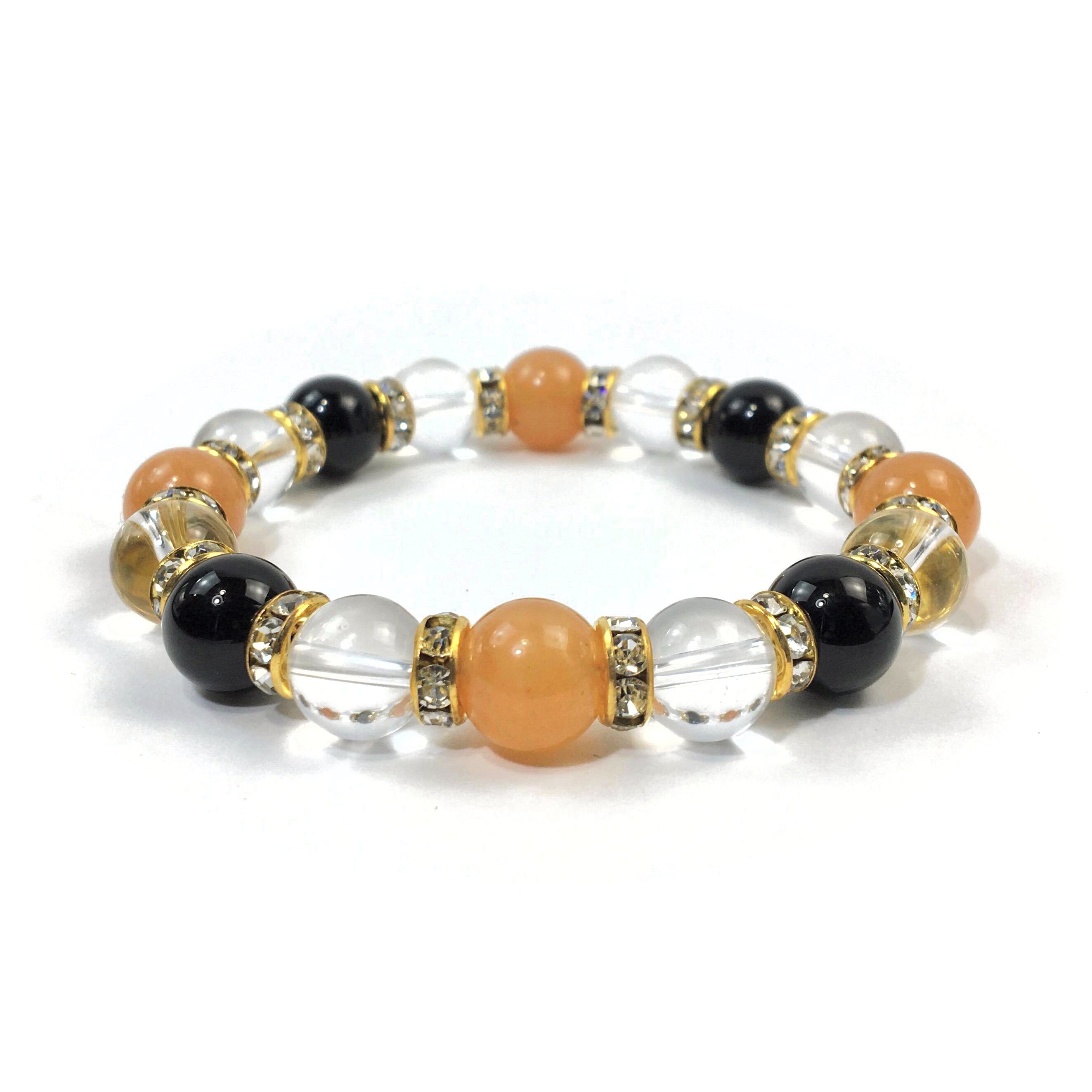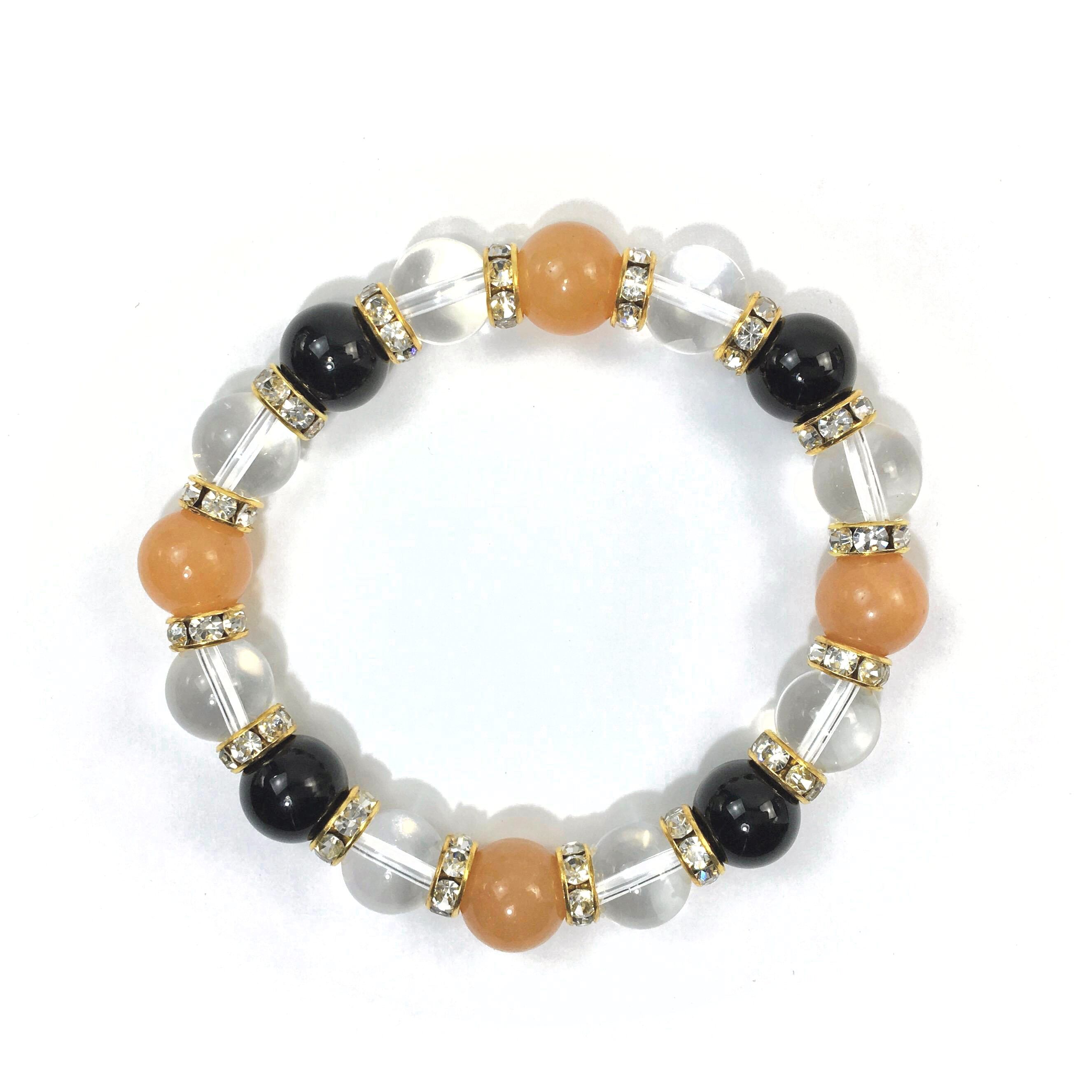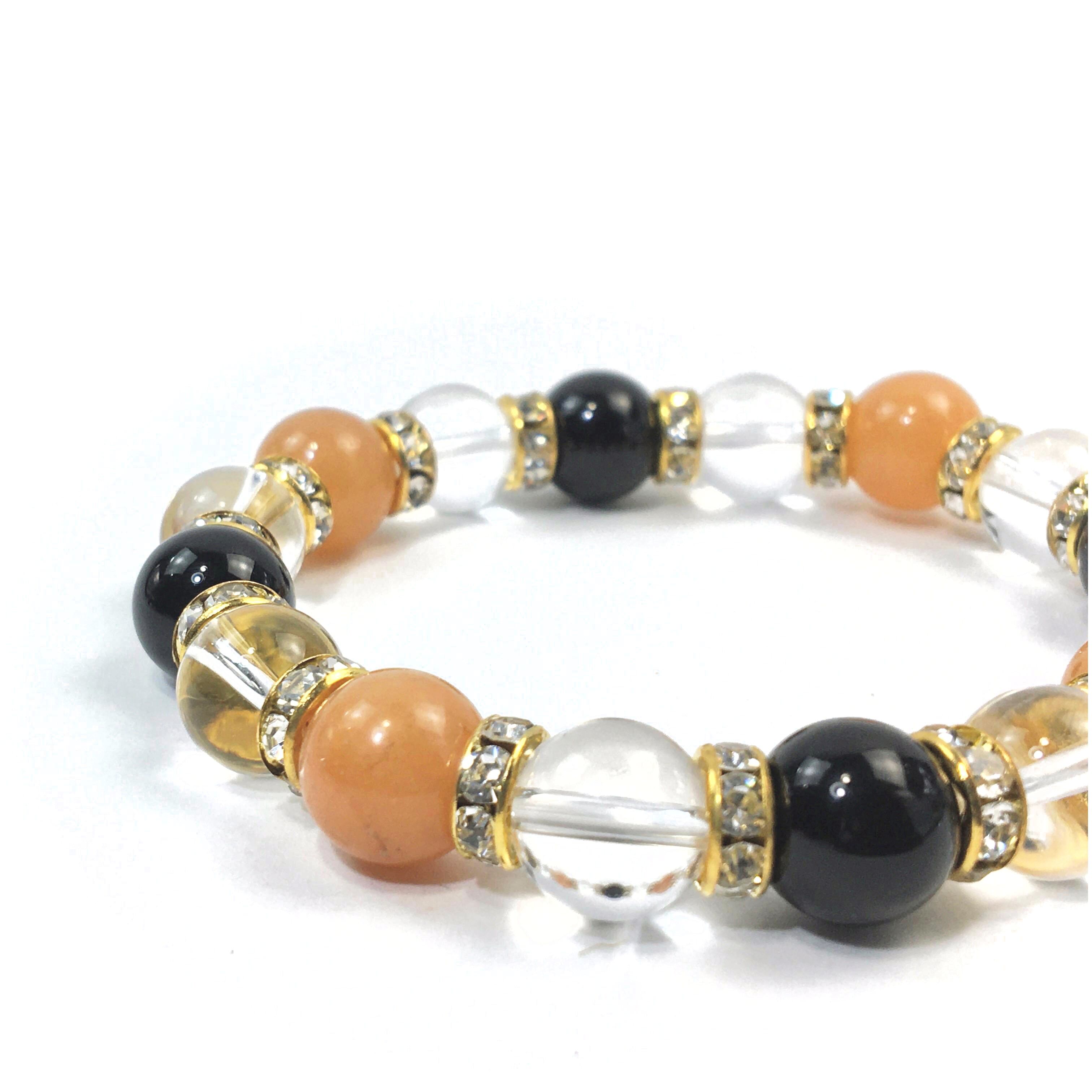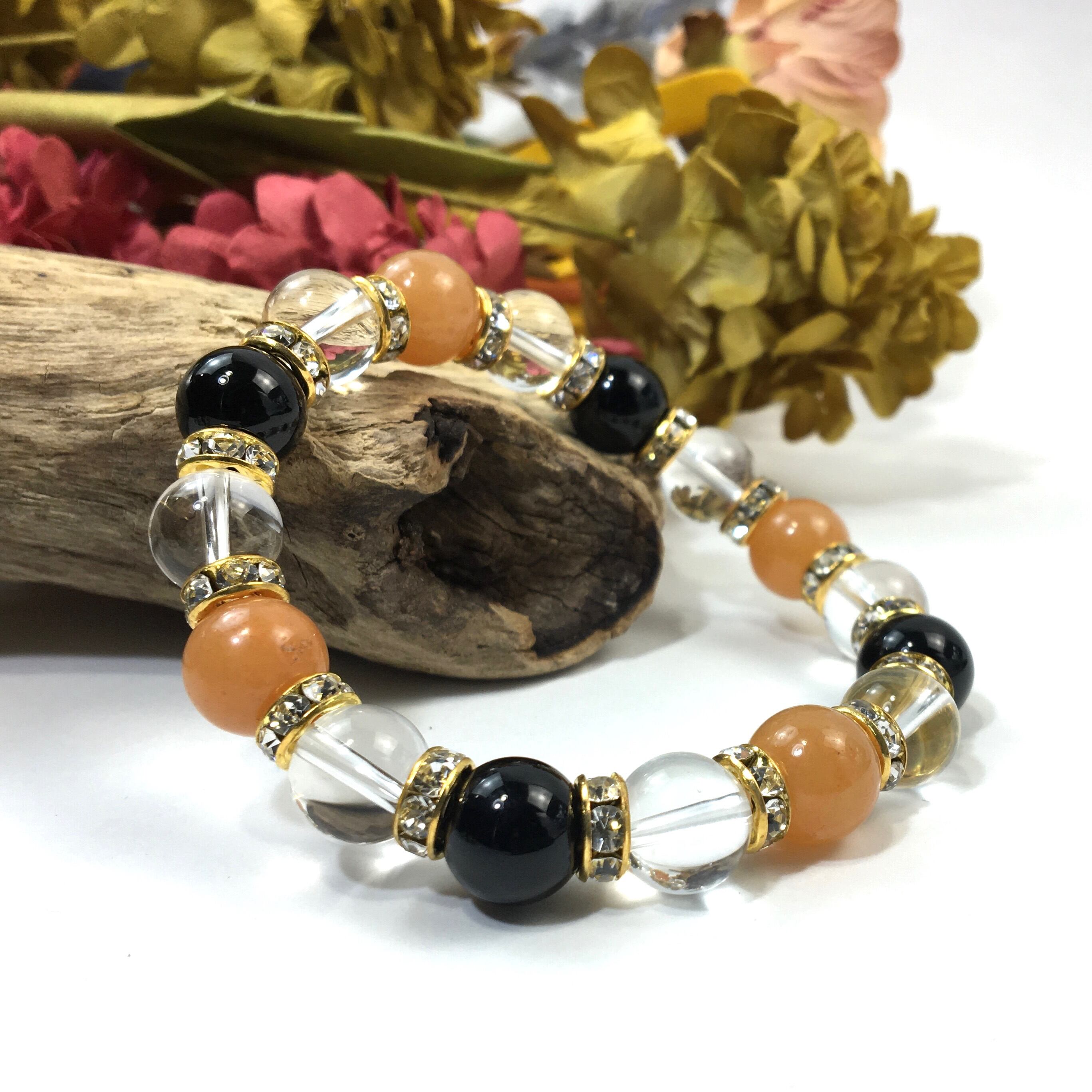 こちらは、レッドアベンチュリンと水晶とオニキスを組み合わせたブレスレットです。間にはロンデルを挟み高級感あるデザインに仕上がっています。石大きさは腕にも馴染みやすいように10mm玉で内周約16cmです。数に限りがございますので気になる方はお早めにどうぞ。