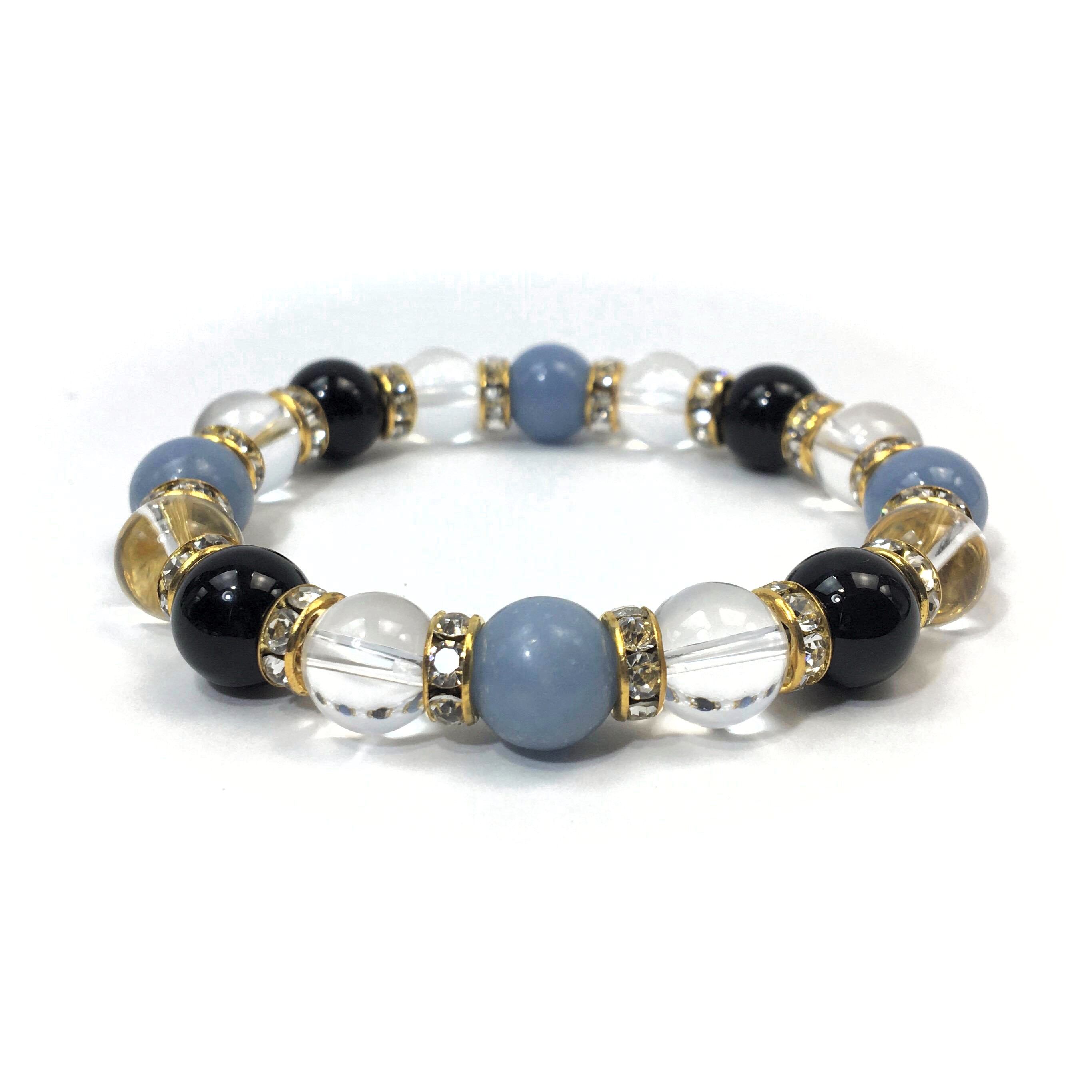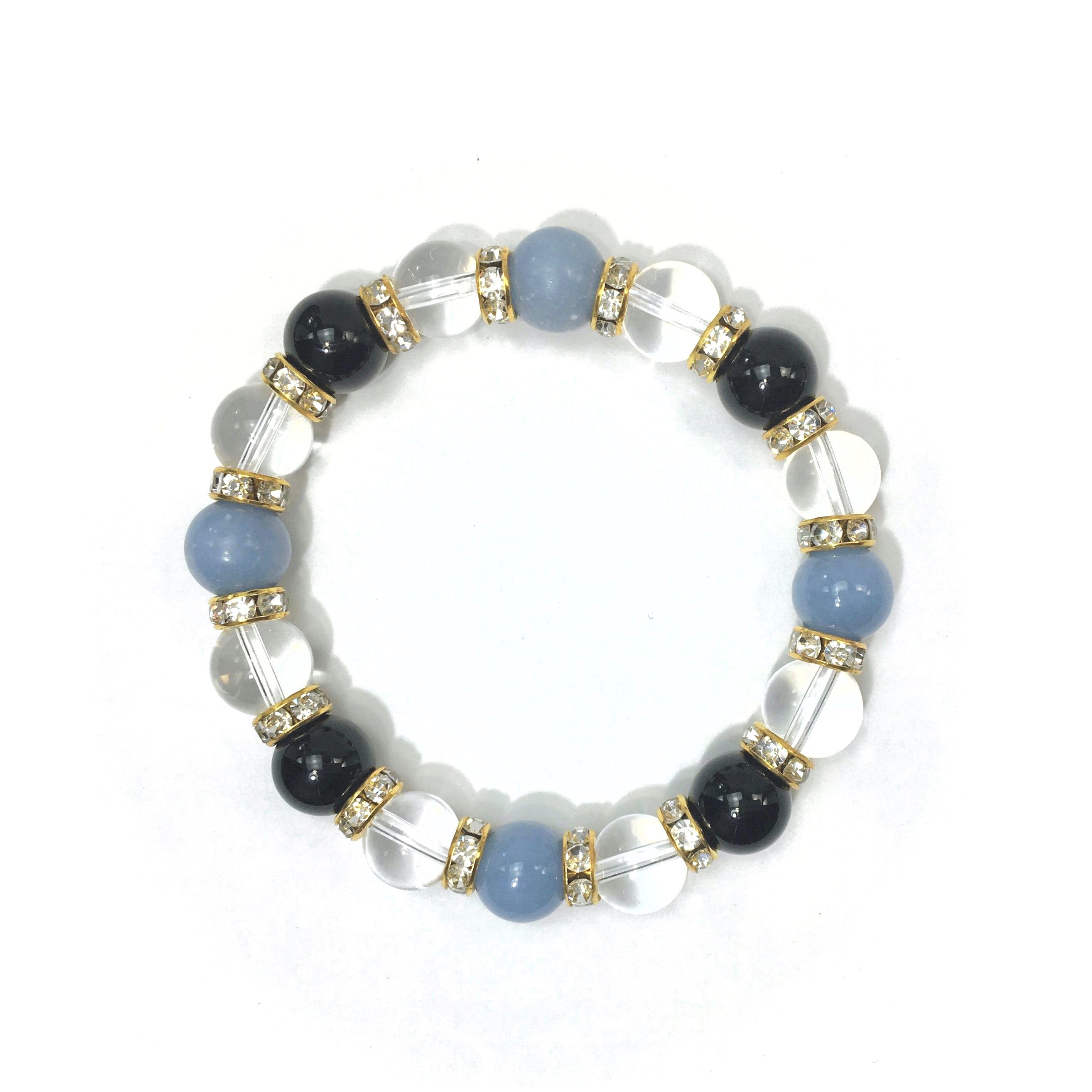 こちらは、エンジェライトと水晶とオニキスを組み合わせたブレスレットです。間にはロンデルを挟み高級感あるデザインに仕上がっています。石大きさは腕にも馴染みやすいように10mm玉で内周約16cmです。数に限りがございますので気になる方はお早めにどうぞ。
