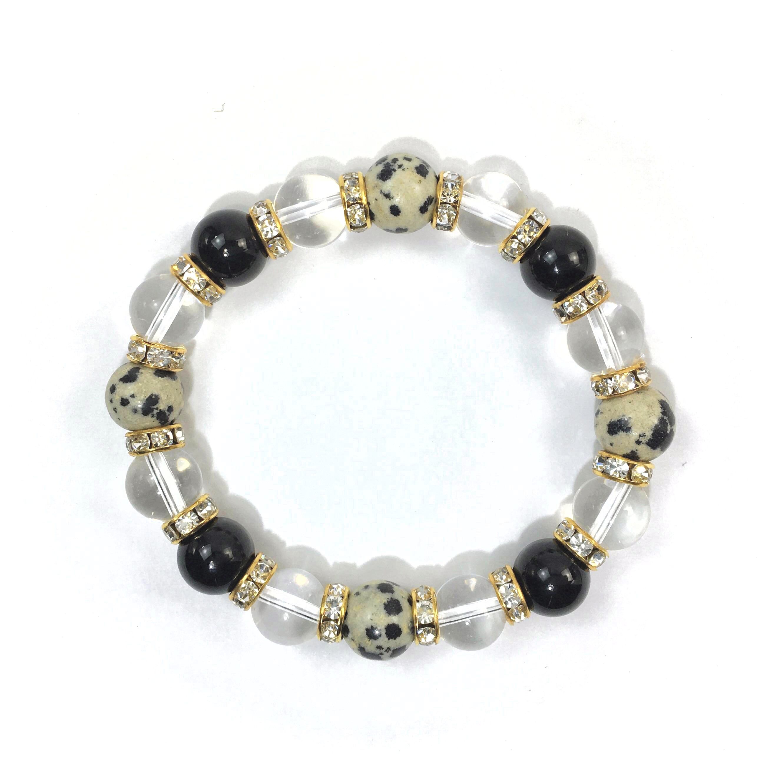 ダルメシアンジャスパー×水晶×オニキス パワーストーン ブレス10mm(ゴールド)メンズ・レディース 男性・女性 数珠ブレス 開運 ☆
