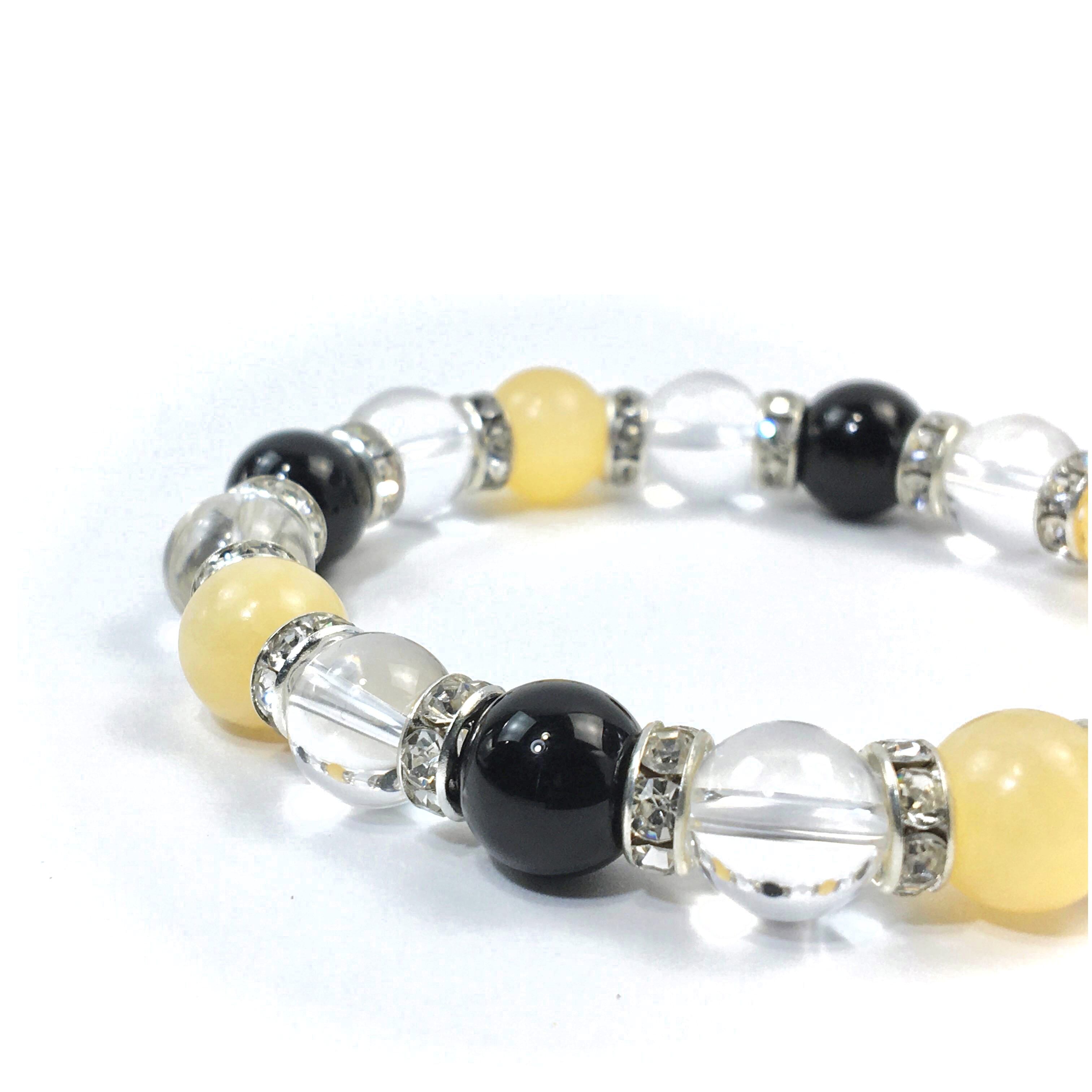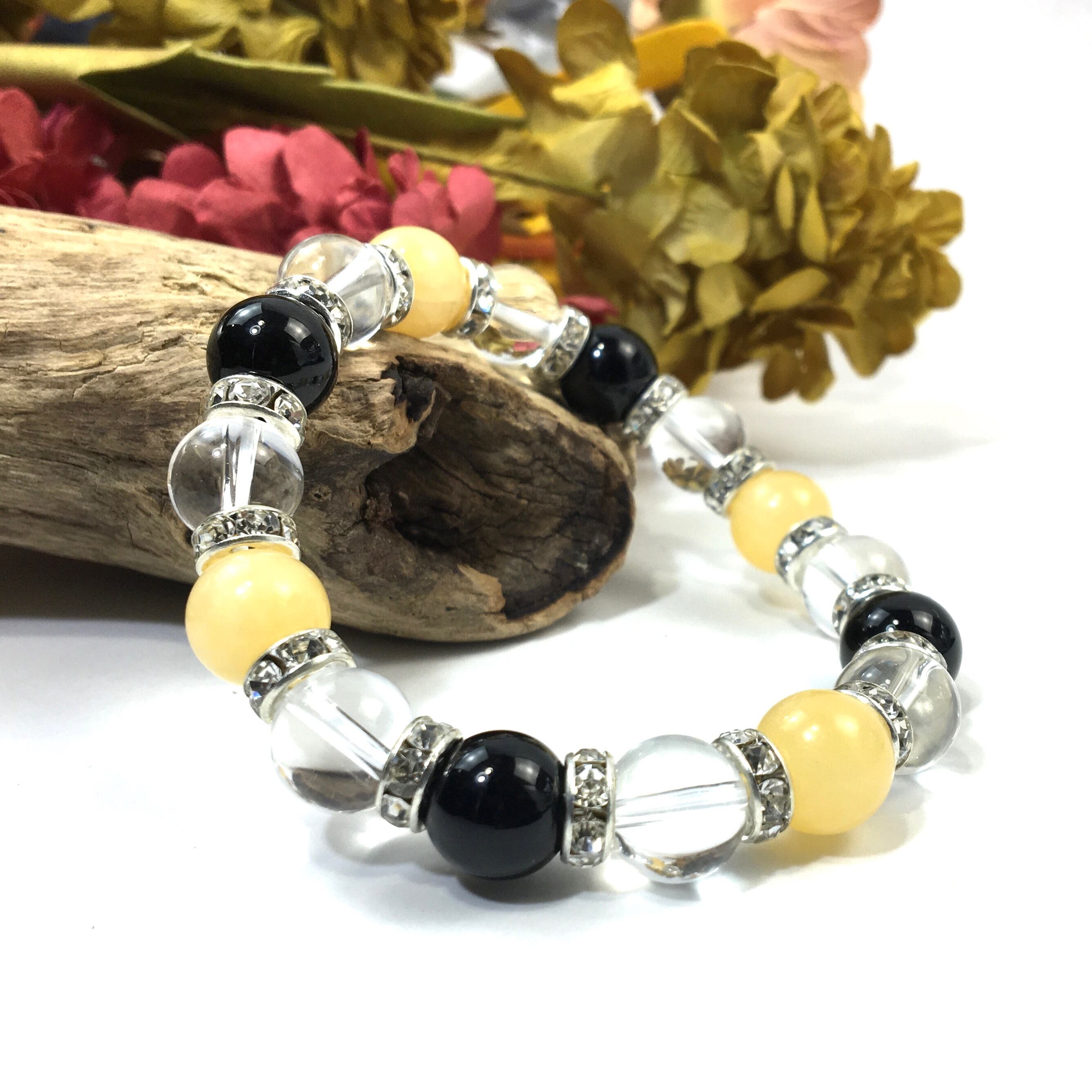 こちらは、アラゴナイトと水晶とオニキスを組み合わせたブレスレットです。間にはロンデルを挟み高級感あるデザインに仕上がっています。石大きさは腕にも馴染みやすいように10mm玉で内周約16cmです。数に限りがございますので気になる方はお早めにどうぞ。