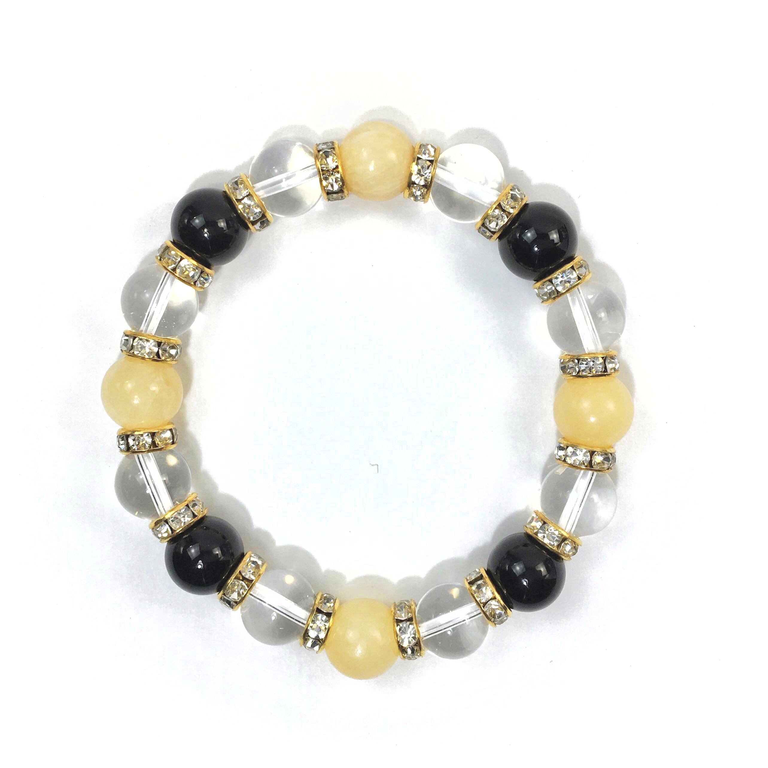 こちらは、アラゴナイトと水晶とオニキスを組み合わせたブレスレットです。間にはロンデルを挟み高級感あるデザインに仕上がっています。石大きさは腕にも馴染みやすいように10mm玉で内周約16cmです。数に限りがございますので気になる方はお早めにどうぞ。