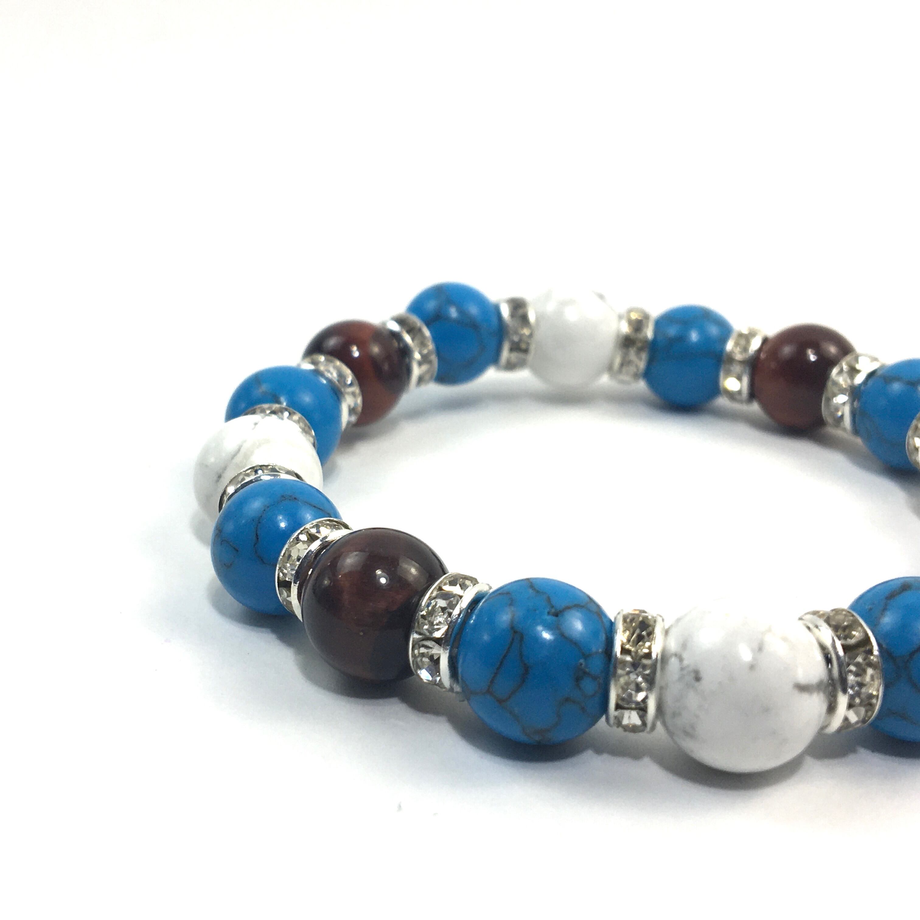 こちらは、レッドタイガーアイとハウライトとターコイズを組み合わせたブレスレットです。間にはロンデルを挟み高級感あるデザインに仕上がっています。石大きさは腕にも馴染みやすいように10mm玉で内周約16cmです。数に限りがございますので気になる方はお早めにどうぞ。