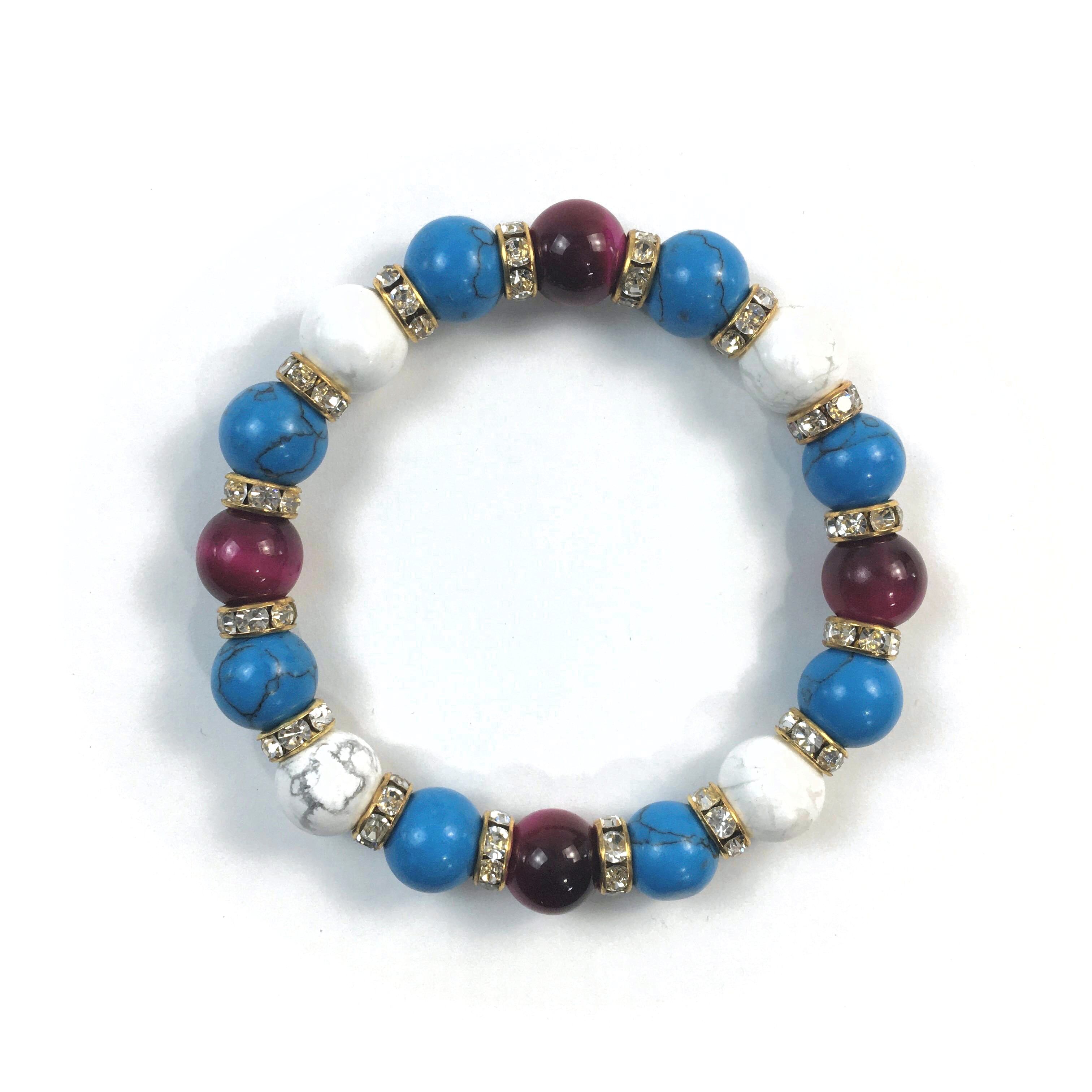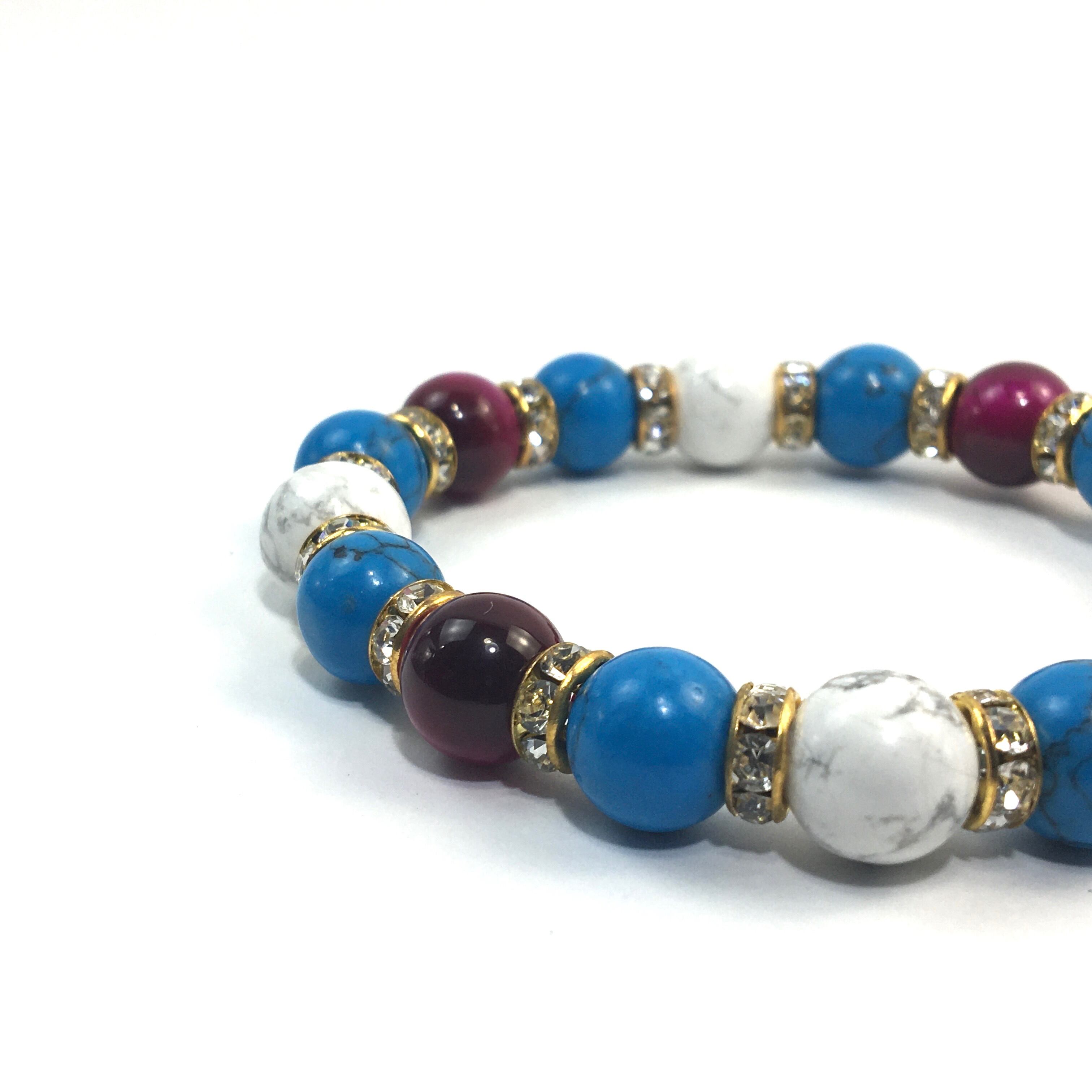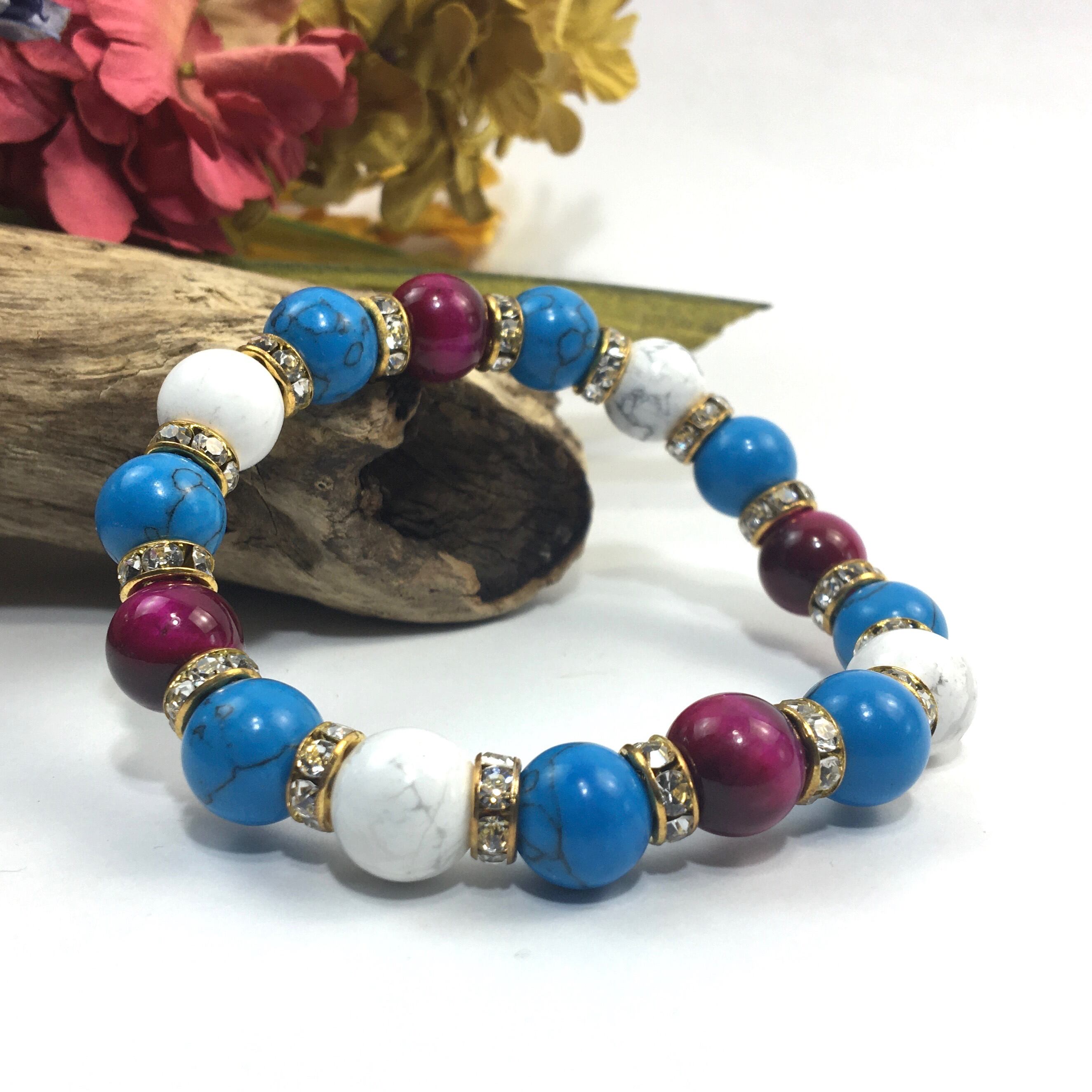 こちらは、ピンクタイガーアイとハウライトとターコイズを組み合わせたブレスレットです。間にはロンデルを挟み高級感あるデザインに仕上がっています。石大きさは腕にも馴染みやすいように10mm玉で内周約16cm(伸可能)です。数に限りがございますので気になる方はお早めにどうぞ。