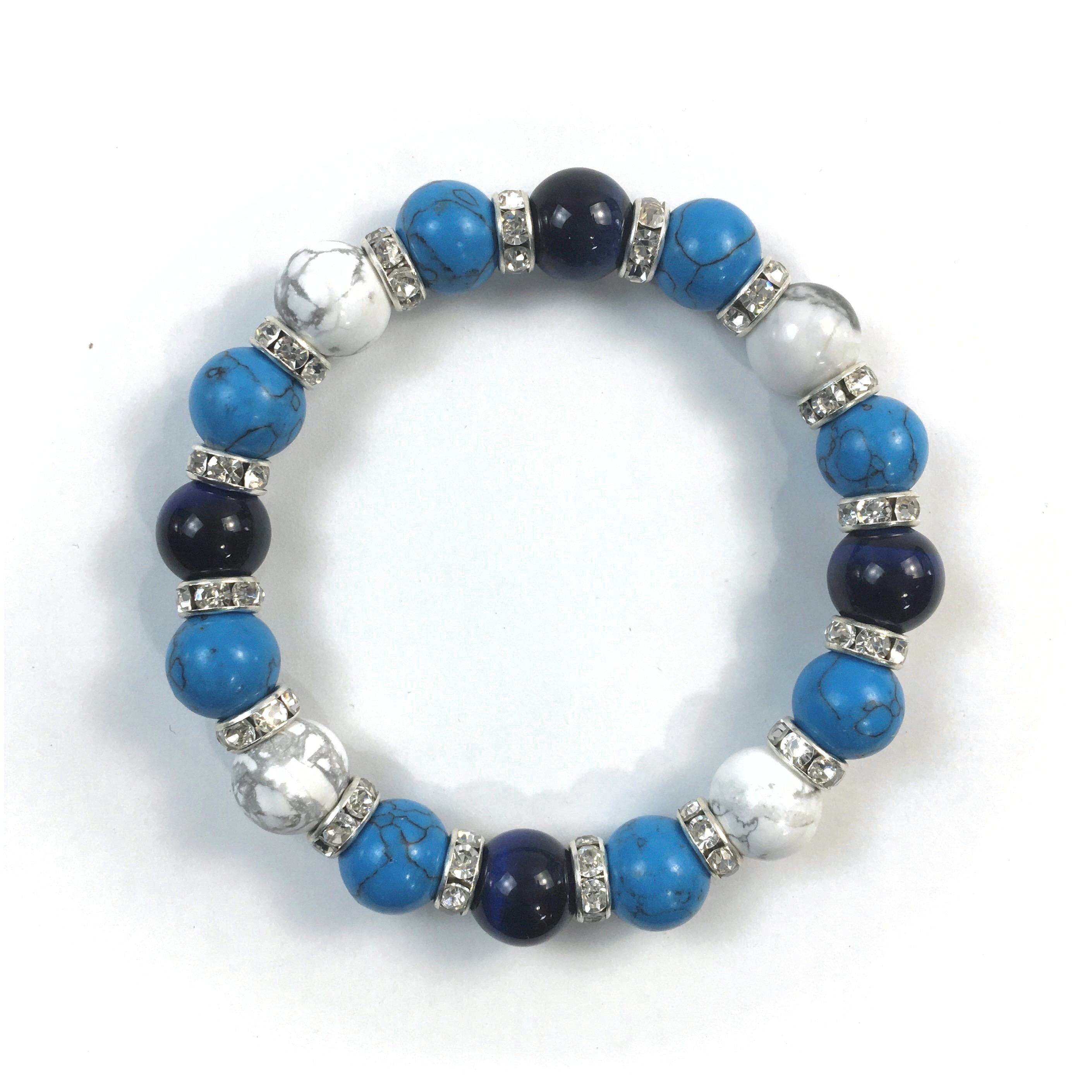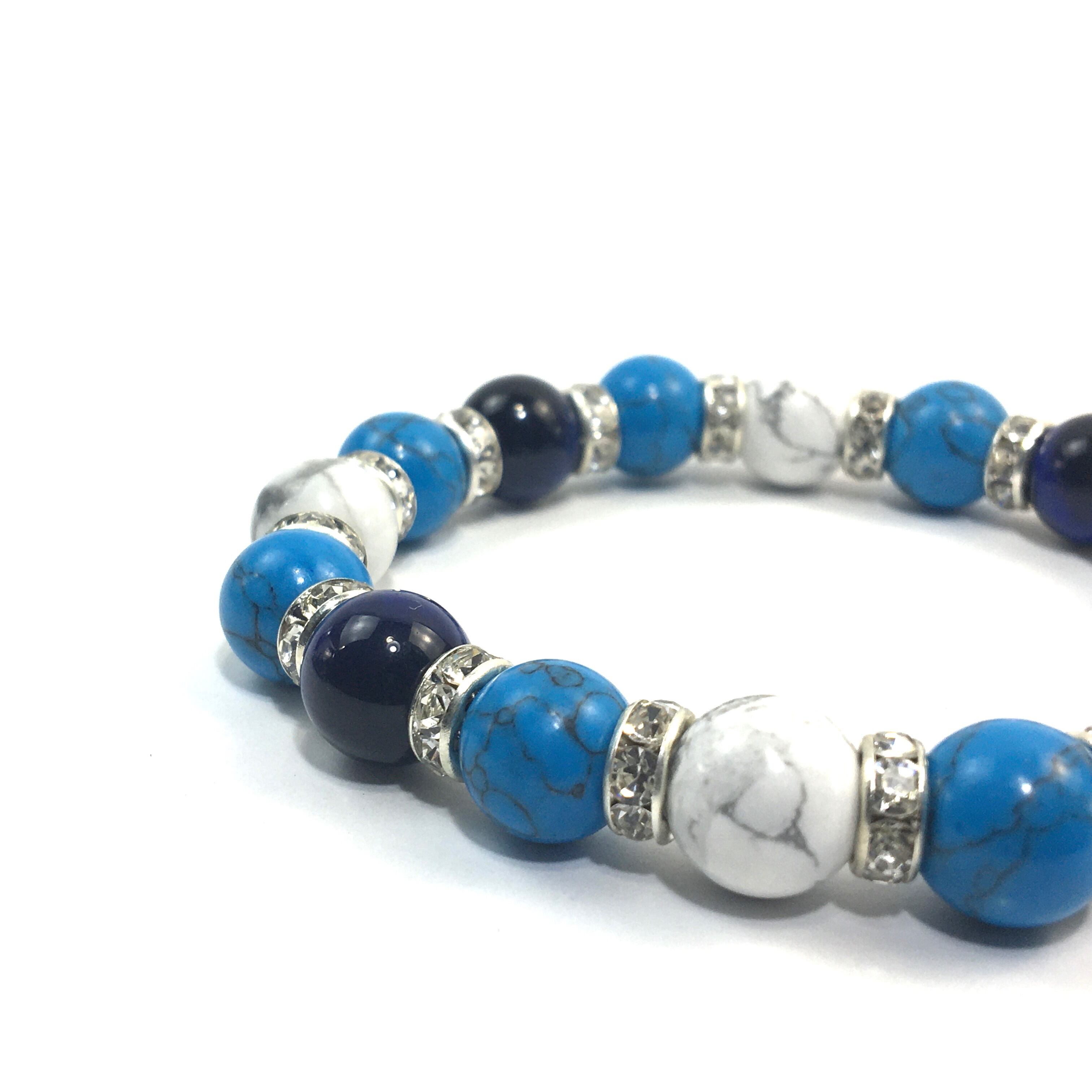 こちらは、ブルータイガーアイとハウライトとターコイズを組み合わせたブレスレットです。間にはロンデルを挟み高級感あるデザインに仕上がっています。石大きさは腕にも馴染みやすいように10mm玉で内周約16cmです。数に限りがございますので気になる方はお早めにどうぞ。