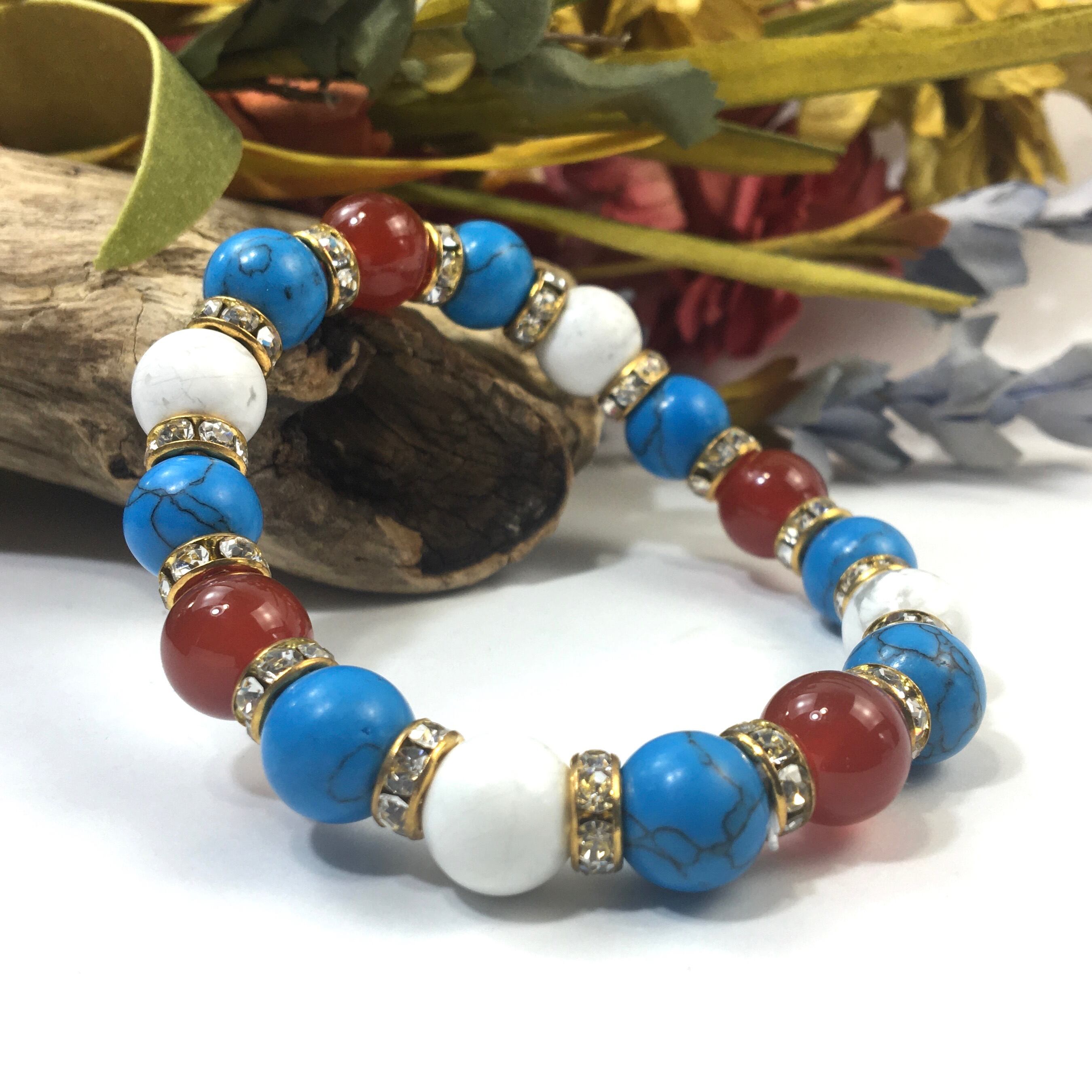 こちらは、赤瑪瑙とハウライトとターコイズを組み合わせたブレスレットです。間にはロンデルを挟み高級感あるデザインに仕上がっています。石大きさは腕にも馴染みやすいように10mm玉で内周約16cmです。数に限りがございますので気になる方はお早めにどうぞ。