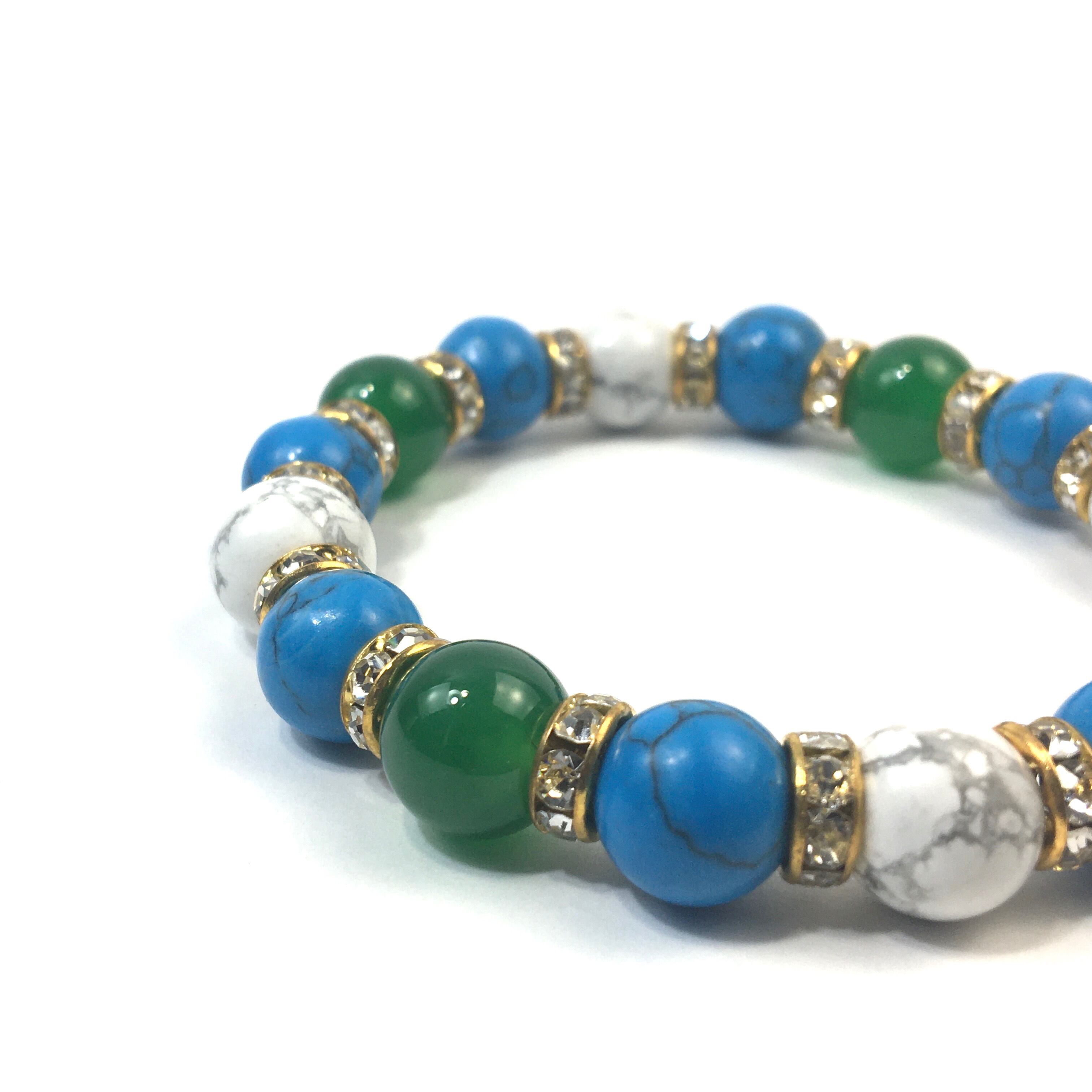 こちらは、緑瑪瑙とハウライトとターコイズを組み合わせたブレスレットです。間にはロンデルを挟み高級感あるデザインに仕上がっています。石大きさは腕にも馴染みやすいように10mm玉で内周約16cmです。数に限りがございますので気になる方はお早めにどうぞ。