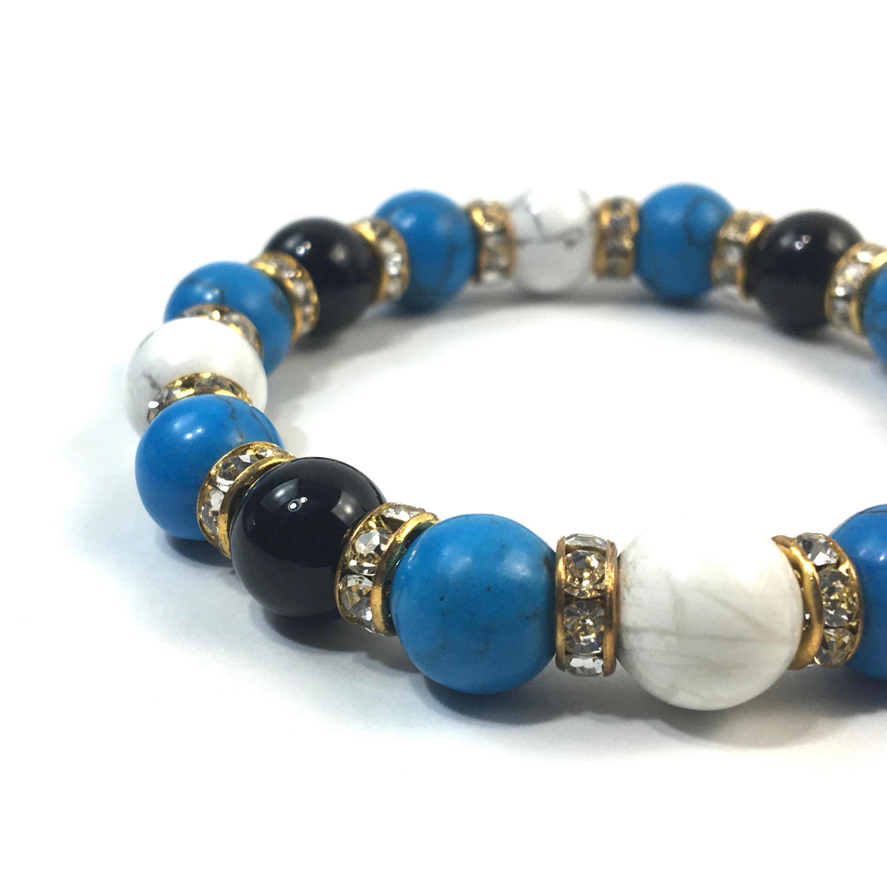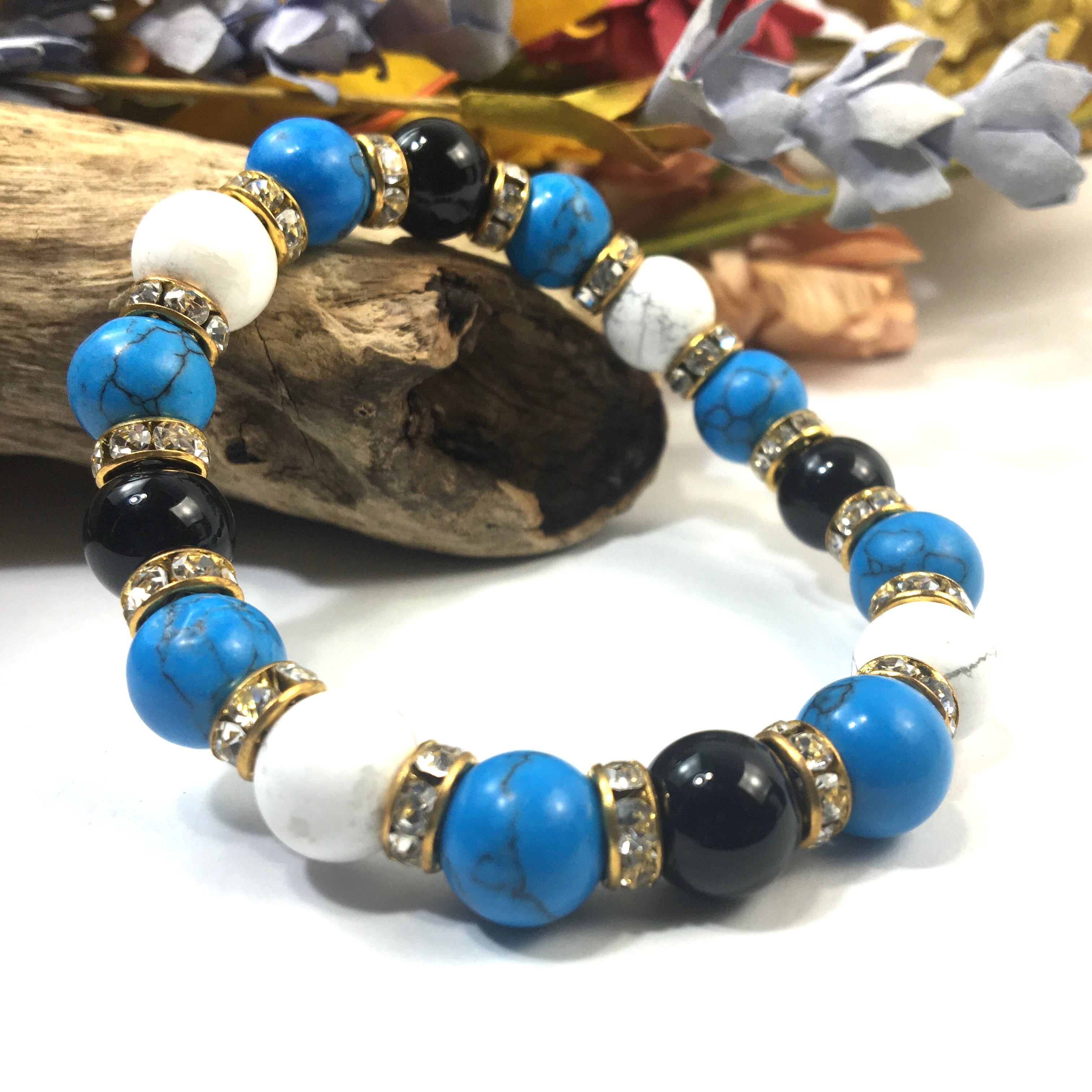 こちらは、オニキスとハウライトとターコイズを組み合わせたブレスレットです。間にはロンデルを挟み高級感あるデザインに仕上がっています。石大きさは腕にも馴染みやすいように10mm玉で内周約16cmです。数に限りがございますので気になる方はお早めにどうぞ。