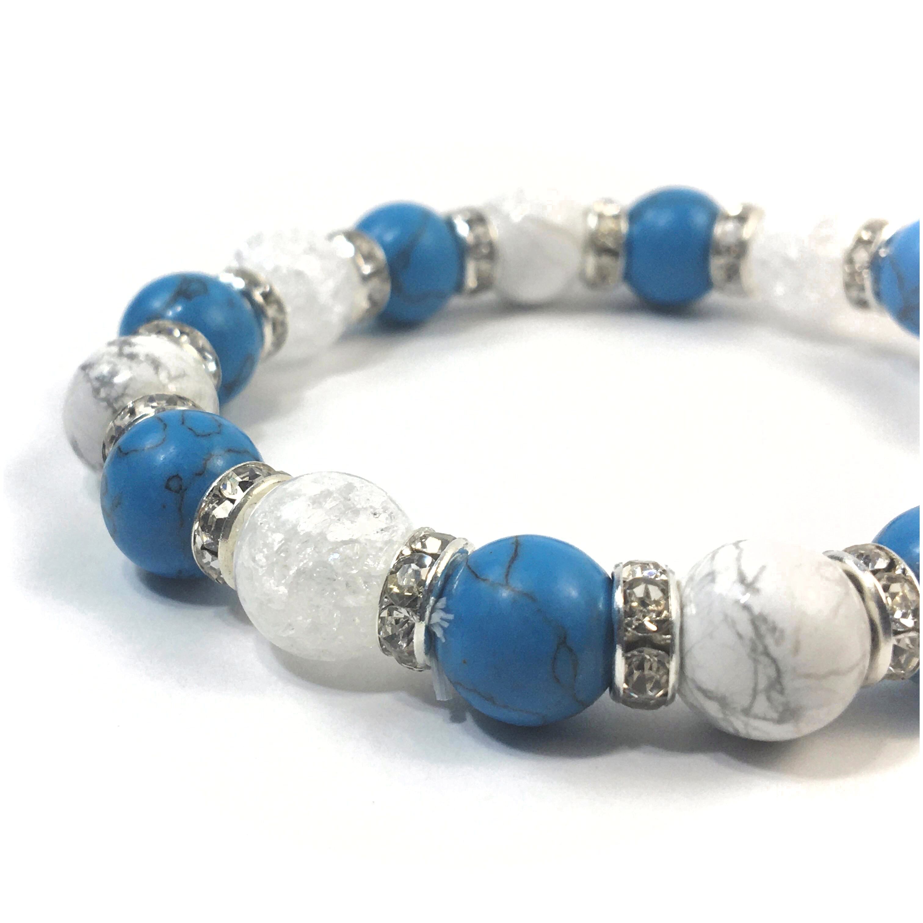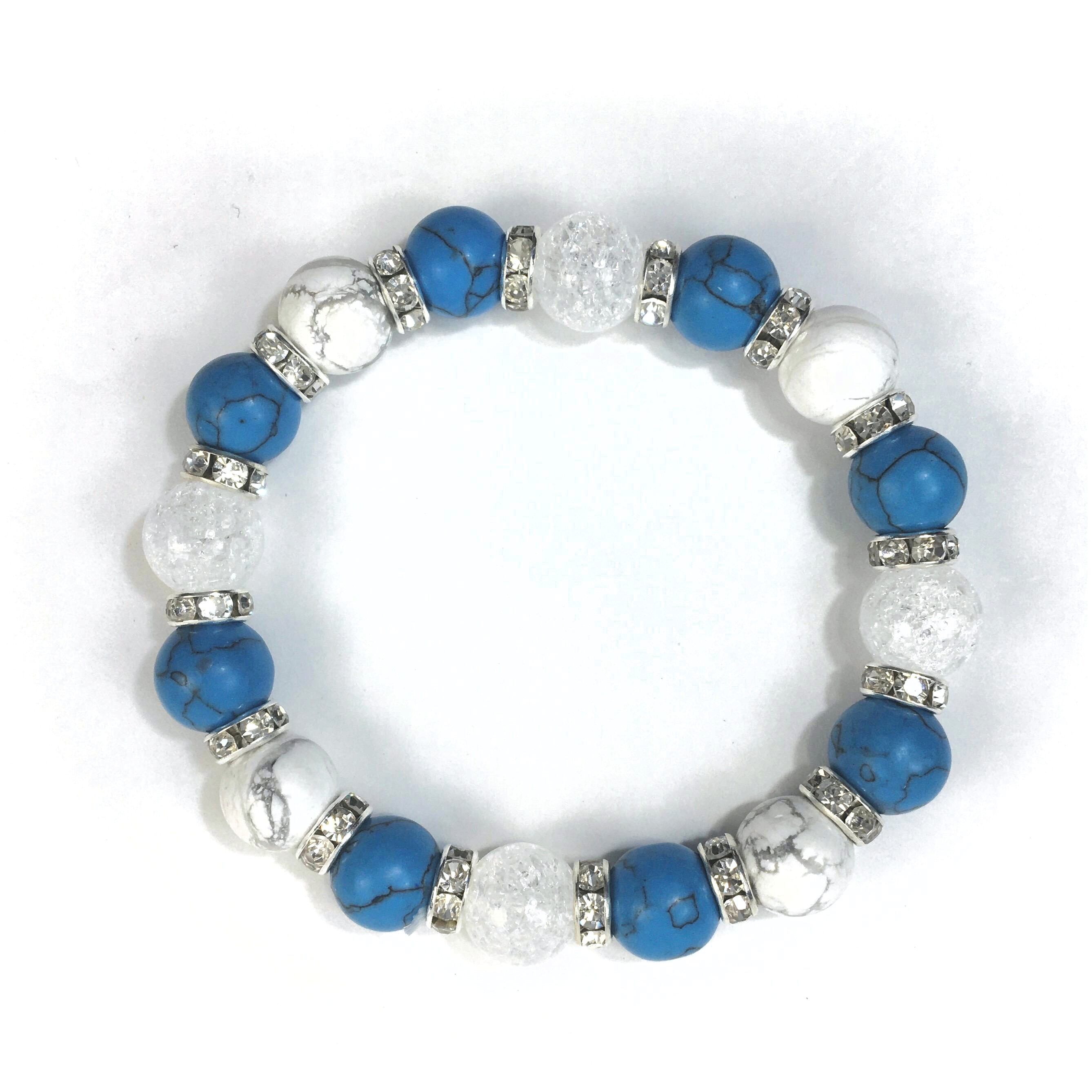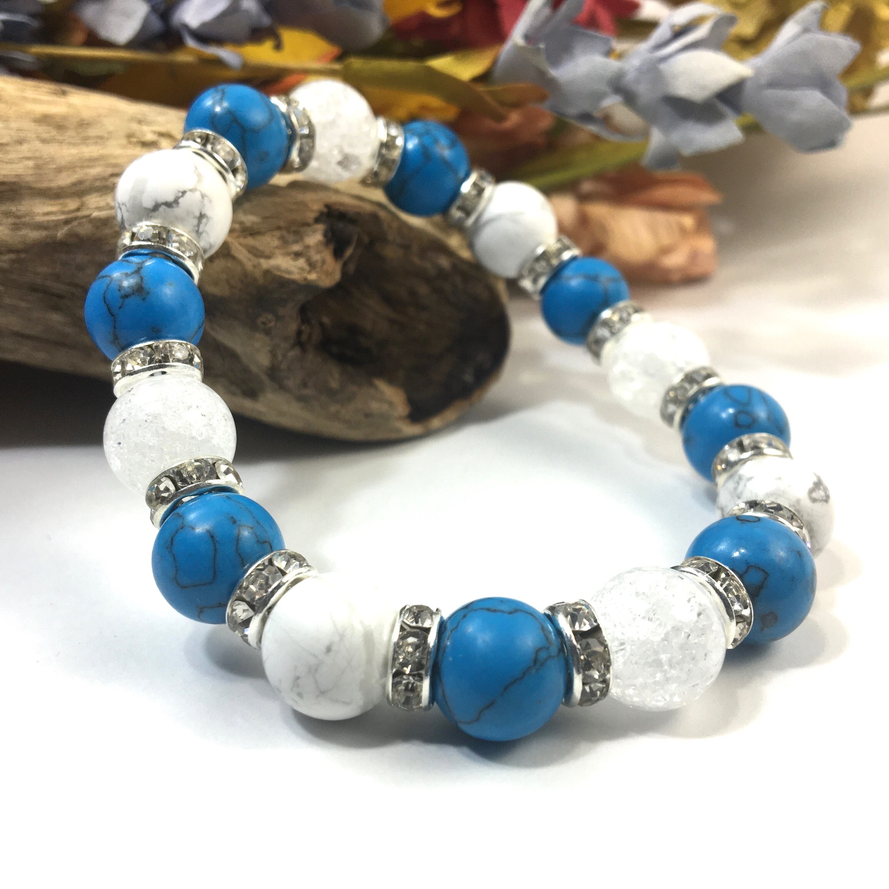 こちらは、クラック水晶とハウライトとターコイズを組み合わせたブレスレットです。間にはロンデルを挟み高級感あるデザインに仕上がっています。石大きさは腕にも馴染みやすいように10mm玉で内周約16cmです。数に限りがございますので気になる方はお早めにどうぞ。