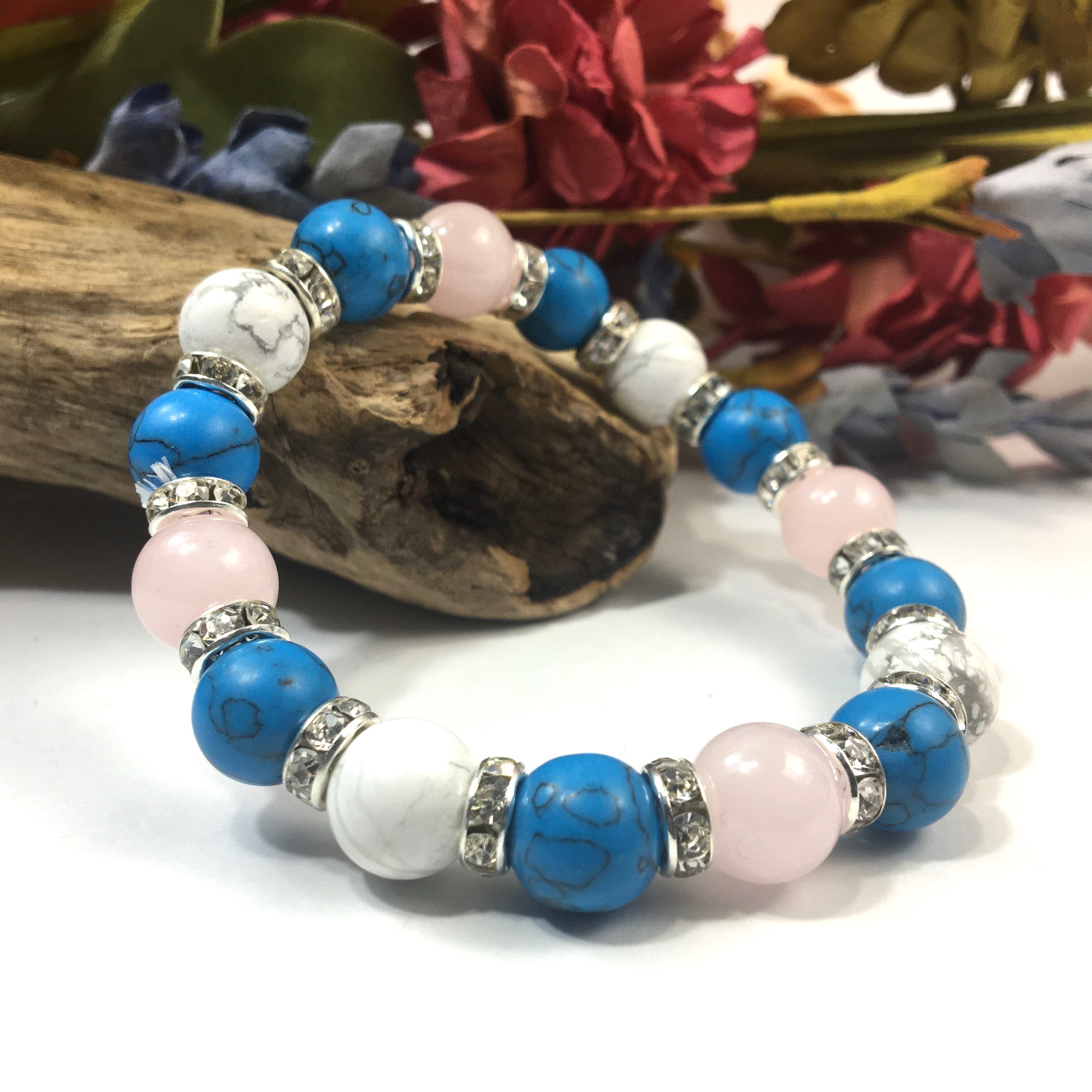 こちらは、ローズクォーツとハウライトとターコイズを組み合わせたブレスレットです。間にはロンデルを挟み高級感あるデザインに仕上がっています。石大きさは腕にも馴染みやすいように10mm玉で内周約16cmです。数に限りがございますので気になる方はお早めにどうぞ。