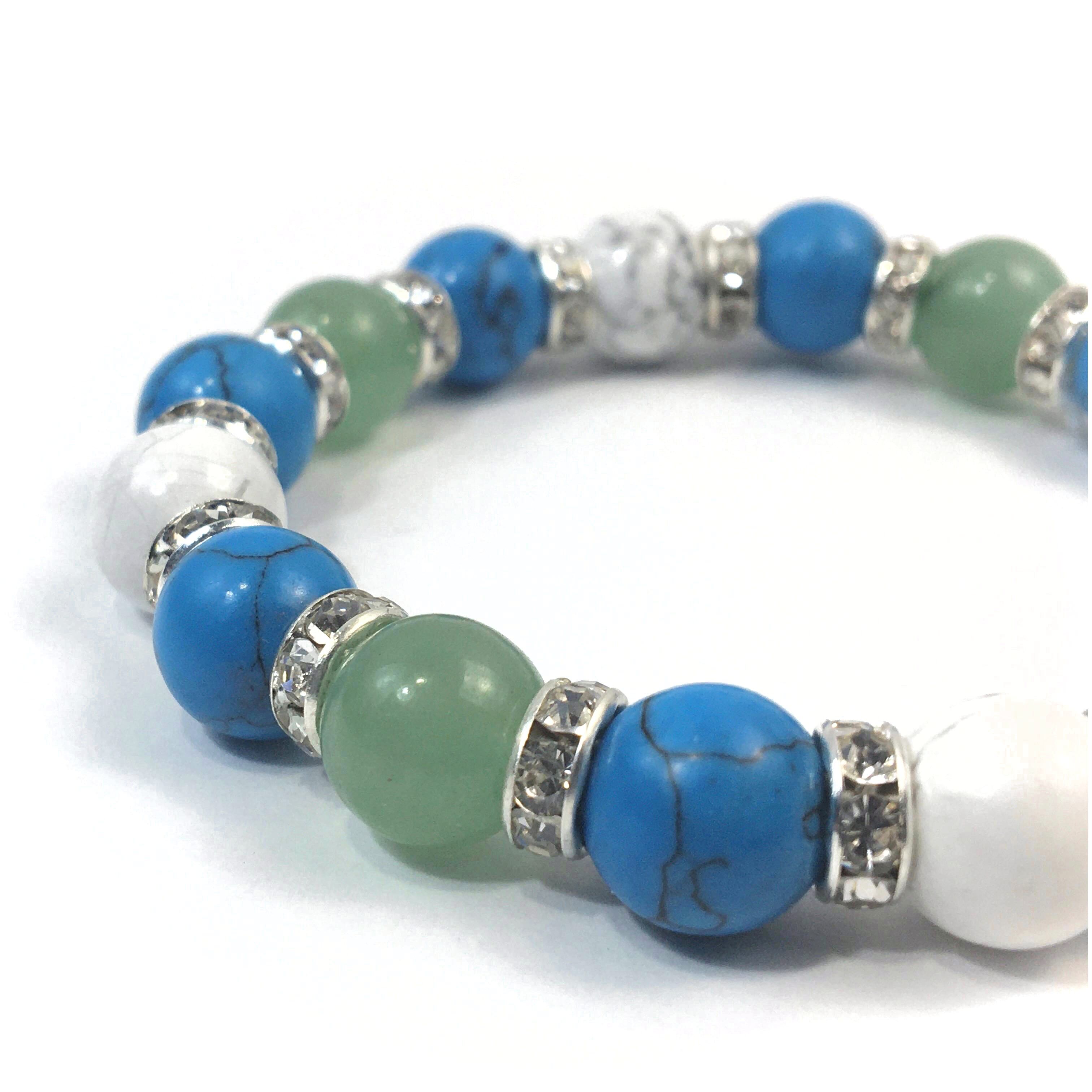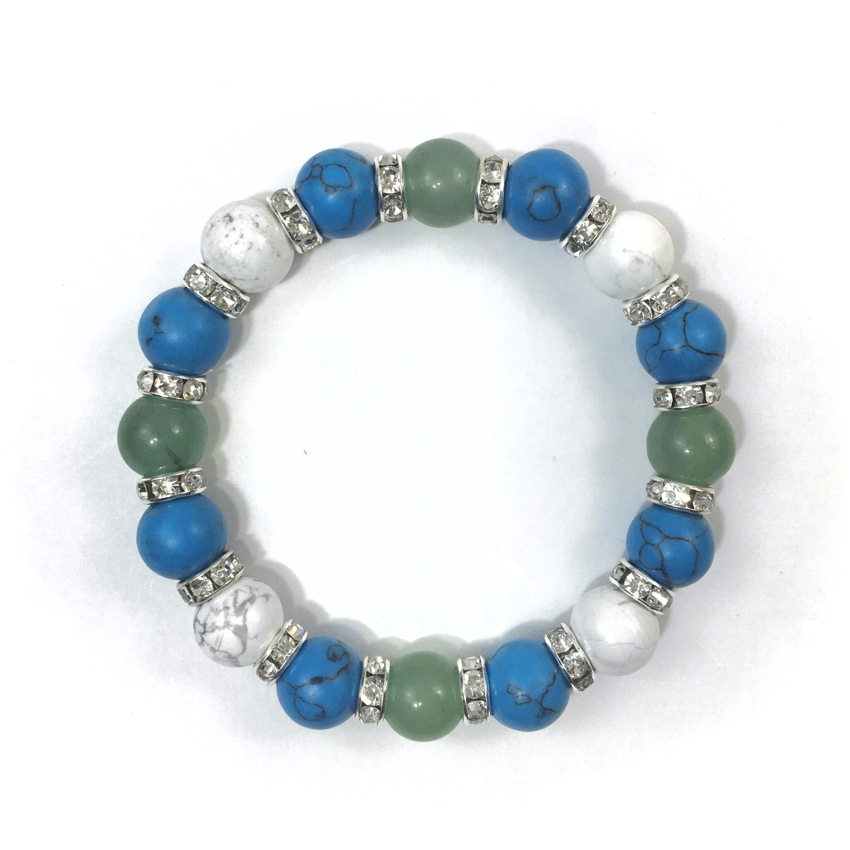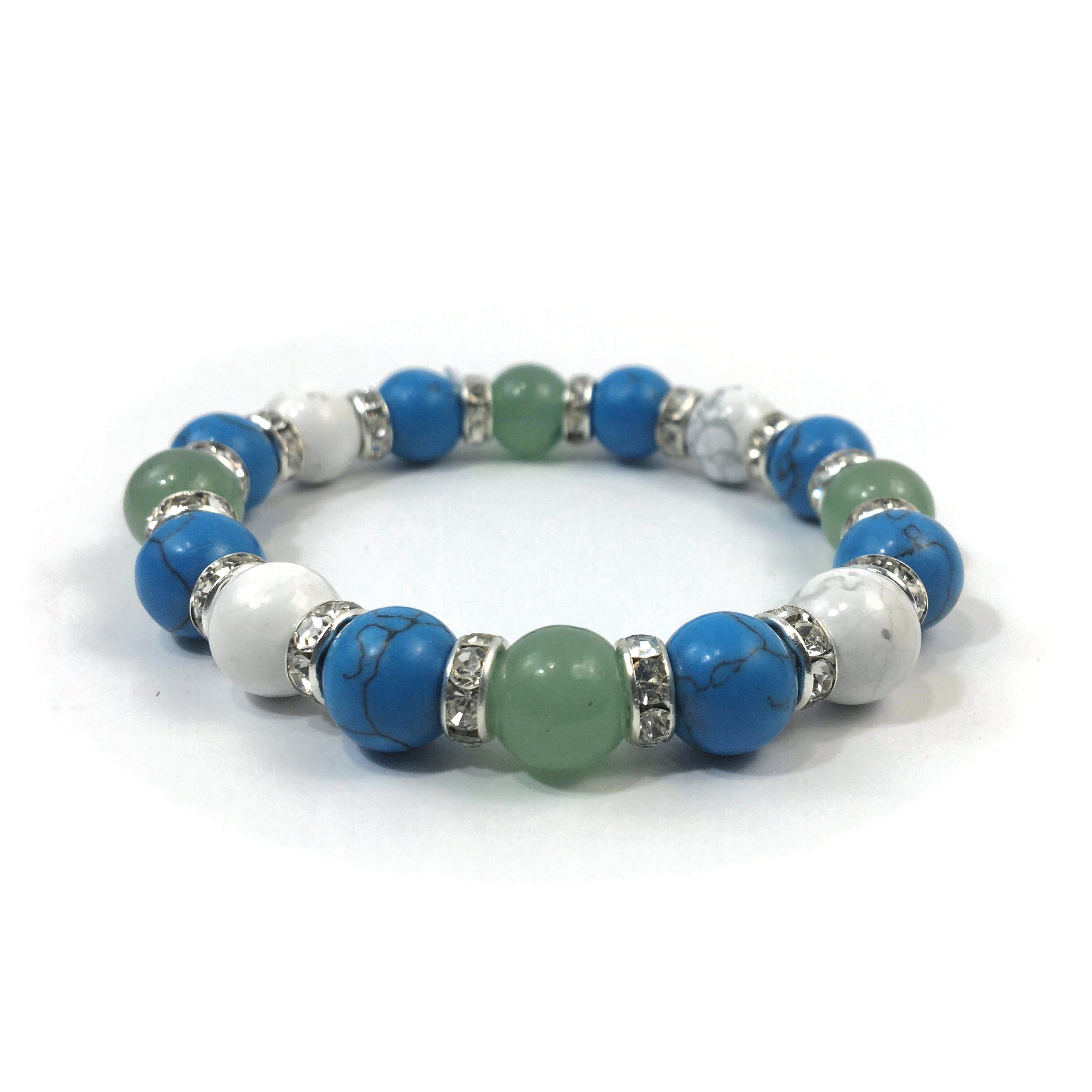 こちらは、アベンチュリンとハウライトとターコイズを組み合わせたブレスレットです。間にはロンデルを挟み高級感あるデザインに仕上がっています。石大きさは腕にも馴染みやすいように10mm玉で内周約16cmです。数に限りがございますので気になる方はお早めにどうぞ。