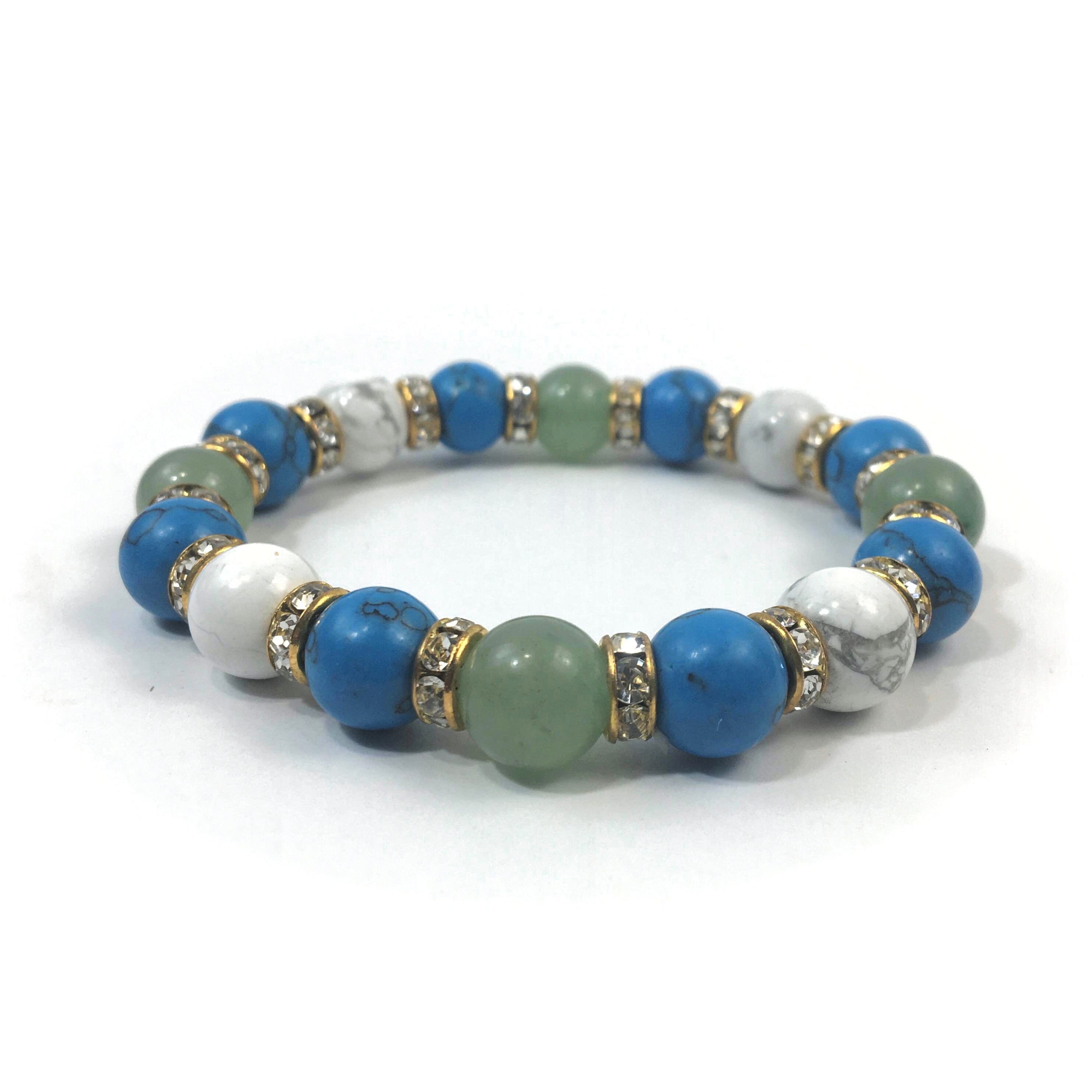 こちらは、アベンチュリンとハウライトとターコイズを組み合わせたブレスレットです。間にはロンデルを挟み高級感あるデザインに仕上がっています。石大きさは腕にも馴染みやすいように10mm玉で内周約16cmです。数に限りがございますので気になる方はお早めにどうぞ。